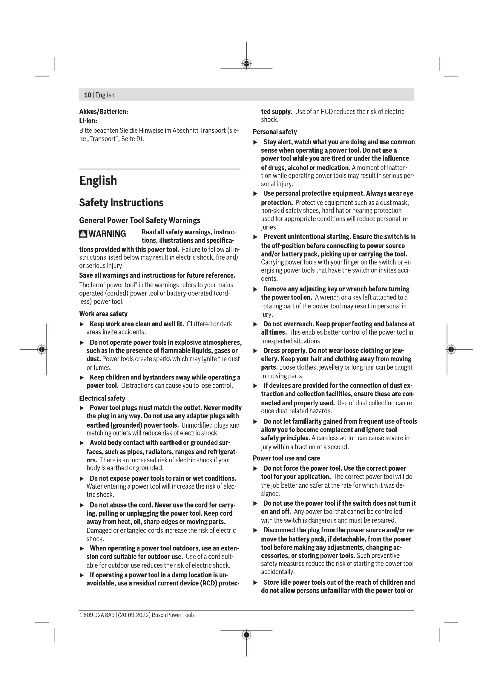 äußeren Abmessung größer als 25cm sind, im Einzel- handelsgeschäft oder in unmittelbarer Nähe hierzu un- entgeltlich zurückzunehmen; die Rücknahme darf nicht an den Kauf eines Elektro- oder Elektronikgerätes ge- knüpft werden und ist auf drei Altgeräte pro Geräteart beschränkt. Der Vertreiber hat beim Abschluss des Kaufvertrags für das neue Elektro- oder Elektronikgerät den Endnutzer über die Möglichkeit zur unentgeltlichen Rückgabe bzw. Abholung des Altgeräts zu informieren und den Endnutzer nach seiner Absicht zu befragen, ob bei der Auslieferung des neuen Ge- räts ein Altgerät zurückgegeben wird. Dies gilt auch bei Vertrieb unter Verwendung von Fernkom- munikationsmitteln, wenn die Lager- und Versandflächen für Elektro- und Elektronikgeräte mindestens 400m² betragen oder die gesamten Lager- und Versandflächen mindestens 800m² betragen, wobei die unentgeltliche Abholung auf Elektro- und Elektronikgeräte der Kategorien 1 (Wärmeüber- träger), 2 (Bildschirmgeräte) und 4 (Großgeräte mit mindes- tens einer äußeren Abmessung über 50cm) beschränkt ist. Für alle übrigen Elektro- und Elektronikgeräte muss der Ver- treiber geeignete Rückgabemöglichkeiten in zumutbarer Ent- fernung zum jeweiligen Endnutzer gewährleisten; das gilt auch für Altgeräte, die in keiner äußeren Abmessung größer als 25cm sind, die der Endnutzer zurückgeben will, ohne ein neues Gerät zu kaufen. Bosch Power Tools 1 609 92A 8A9 | (20.09.2022)10 | English Akkus/Batterien: Li-Ion: Bitte beachten Sie die Hinweise im Abschnitt Transport (sie- he „Transport“, Seite9). English Safety Instructions General Power Tool Safety Warnings WARNING Read all safety warnings, instruc- tions, illustrations and specifica- tions provided with this power tool. Failure to follow all in- structions listed below may result in electric shock, fire and/ or serious injury. Save all warnings and instructions for future reference. The term "power tool" in the warnings refers to your mains- operated (corded) power tool or battery-operated (cord- less) power tool. Work area safety u Keep work area clean and well lit. Cluttered or dark areas invite accidents. u Do not operate power tools in explosive atmospheres, such as in the presence of flammable liquids, gases or dust. Power tools create sparks which may ignite the dust or fumes. u Keep children and bystanders away while operating a power tool. Distractions can cause you to lose control. Electrical safety u Power tool plugs must match the outlet. Never modify the plug in any way. Do not use any adapter plugs with earthed (grounded) power tools. Unmodified plugs and matching outlets will reduce risk of electric shock. u Avoid body contact with earthed or grounded sur- faces, such as pipes, radiators, ranges and refrigerat- ors. There is an increased risk of electric shock if your body is earthed or grounded. u Do not expose power tools to rain or wet conditions. Water entering a power tool will increase the risk of elec- tric shock. u Do not abuse the cord. Never use the cord for carry- ing, pulling or unplugging the power tool. Keep cord away from heat, oil, sharp edges or moving parts. Damaged or entangled cords increase the risk of electric shock. u When operating a power tool outdoors, use an exten- sion cord suitable for outdoor use. Use of a cord suit- able for outdoor use reduces the risk of electric shock. u If operating a power tool in a damp location is un- avoidable, use a residual current device (RCD) protec- ted supply. Use of an RCD reduces the risk of electric shock. Personal safety u Stay alert, watch what you are doing and use common sense when operating a power tool. Do not use a power tool while you are tired or under the influence of drugs, alcohol or medication. A moment of inatten- tion while operating power tools may result in serious per- sonal injury. u Use personal protective equipment. Always wear eye protection. Protective equipment such as a dust mask, non-skid safety shoes, hard hat or hearing protection used for appropriate conditions will reduce personal in- juries. u Prevent unintentional starting. Ensure the switch is in the off-position before connecting to power source and/or battery pack, picking up or carrying the tool. Carrying power tools with your finger on the switch or en- ergising power tools that have the switch on invites acci- dents. u Remove any adjusting key or wrench before turning the power tool on. A wrench or a key left attached to a rotating part of the power tool may result in personal in- jury. u Do not overreach. Keep proper footing and balance at all times. This enables better control of the power tool in unexpected situations. u Dress properly. Do not wear loose clothing or jew- ellery. Keep your hair and clothing away from moving parts. Loose clothes, jewellery or long hair can be caught in moving parts. u If devices are provided for the connection of dust ex- traction and collection facilities, ensure these are con- nected and properly used. Use of dust collection can re- duce dust-related hazards. u Do not let familiarity gained from frequent use of tools allow you to become complacent and ignore tool safety principles. A careless action can cause severe in- jury within a fraction of a second. Power tool use and care u Do not force the power tool. Use the correct power tool for your application. The correct power tool will do the job better and safer at the rate for which it was de- signed. u Do not use the power tool if the switch does not turn it on and off. Any power tool that cannot be controlled with the switch is dangerous and must be repaired. u Disconnect the plug from the power source and/or re- move the battery pack, if detachable, from the power tool before making any adjustments, changing ac- cessories, or storing power tools. Such preventive safety measures reduce the risk of starting the power tool accidentally. u Store idle power tools out of the reach of children and do 
