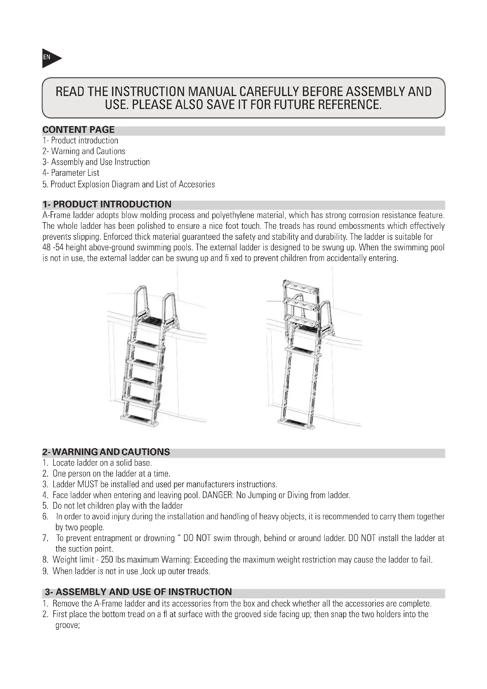 A-Frame ladder adopts blow molding process and polyethylene material, which has strong corrosion resistance feature. The whole ladder has been polished to ensure a nice foot touch. The treads has round embossments which effectively prevents slipping. Enforced thick material guaranteed the safety and stability and durability. The ladder is suitable for 48 -54 height above-ground swimming pools. The external ladder is designed to be swung up. When the swimming pool is not in use, the external ladder can be swung up and fi xed to prevent children from accidentally entering.