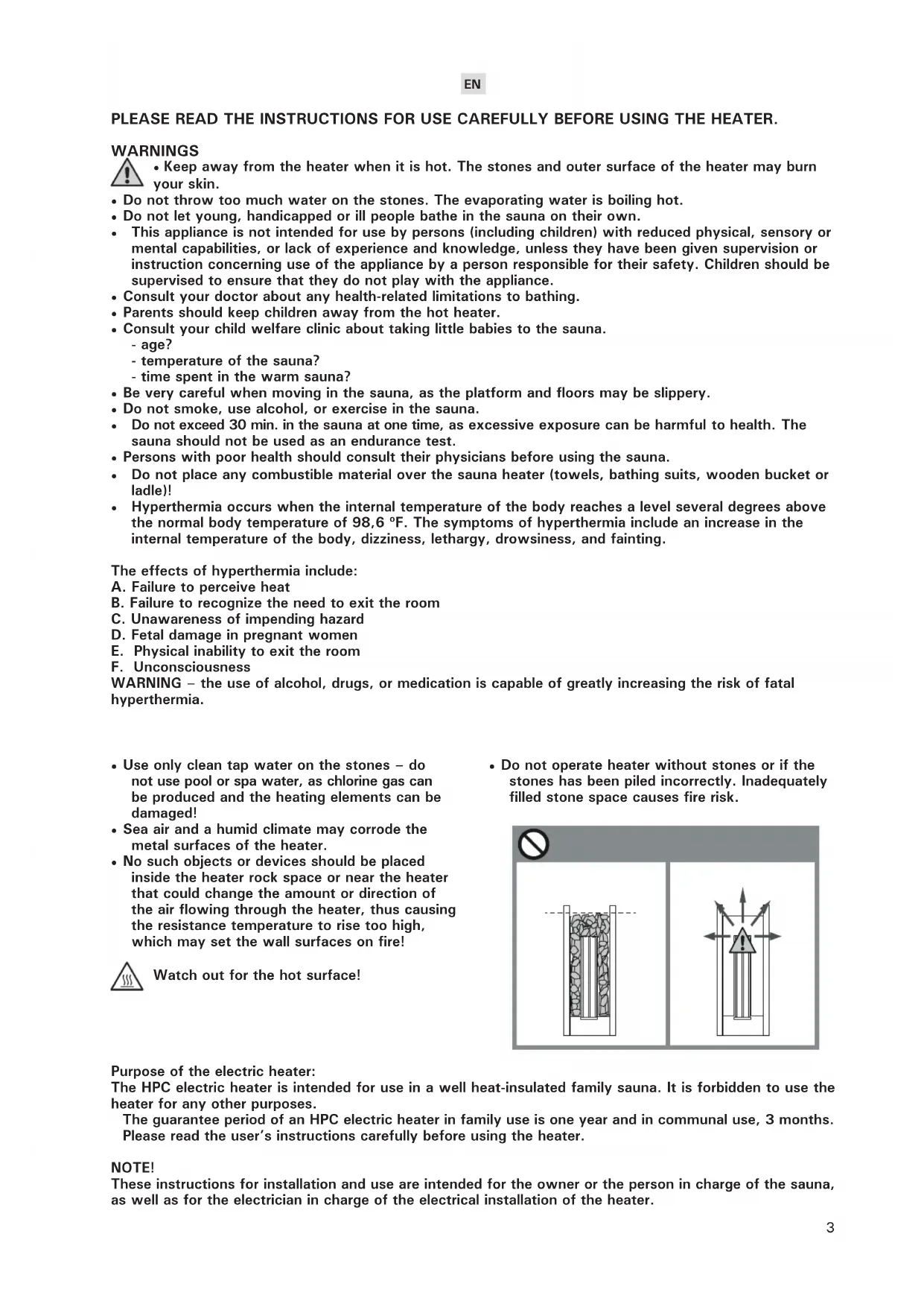 - No such objects or devices should be placed inside the heater rock space or near the heater that could change the amount or direction of the air flowing through the heater, thus causing the resistance temperature to rise too high, which may set the wall surfaces on fire! Purpose of the electric heater: The HPC electric heater is intended for use in a well heat-insulated family sauna. It is forbidden to use the heater for any other purposes. The guarantee period of an HPC electric heater in family use is one year and in communal use, 3 months. Please read the user’s instructions carefully before using the heater. NOTE! These instructions for installation and use are intended for the owner or the person in charge of the sauna, as well as for the electrician in charge of the electrical installation of the heater. Watch out for the hot surface!