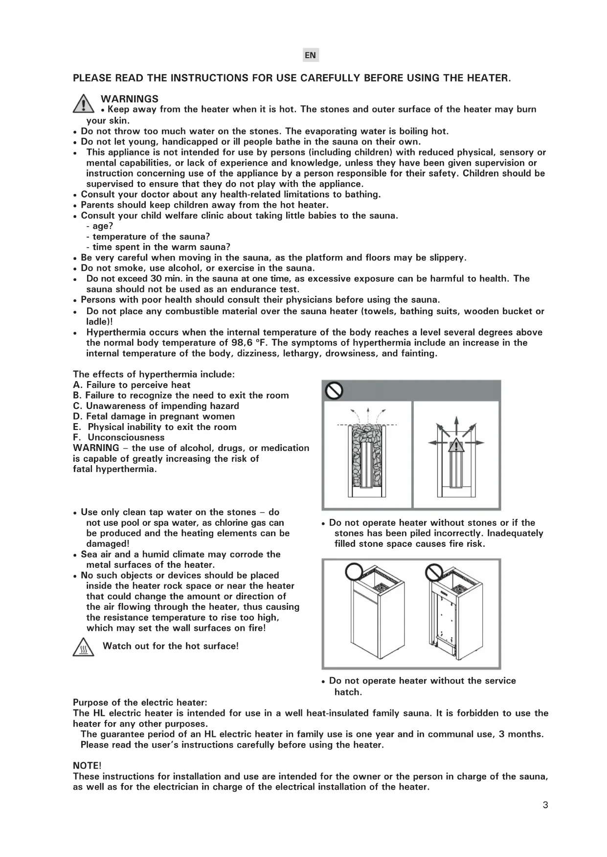 - No such objects or devices should be placed inside the heater rock space or near the heater that could change the amount or direction of the air flowing through the heater, thus causing the resistance temperature to rise too high, which may set the wall surfaces on fire! Purpose of the electric heater: The HL electric heater is intended for use in a well heat-insulated family sauna. It is forbidden to use the heater for any other purposes. The guarantee period of an HL electric heater in family use is one year and in communal use, 3 months. Please read the user’s instructions carefully before using the heater. NOTE! These instructions for installation and use are intended for the owner or the person in charge of the sauna, as well as for the electrician in charge of the electrical installation of the heater. Watch out for the hot surface!