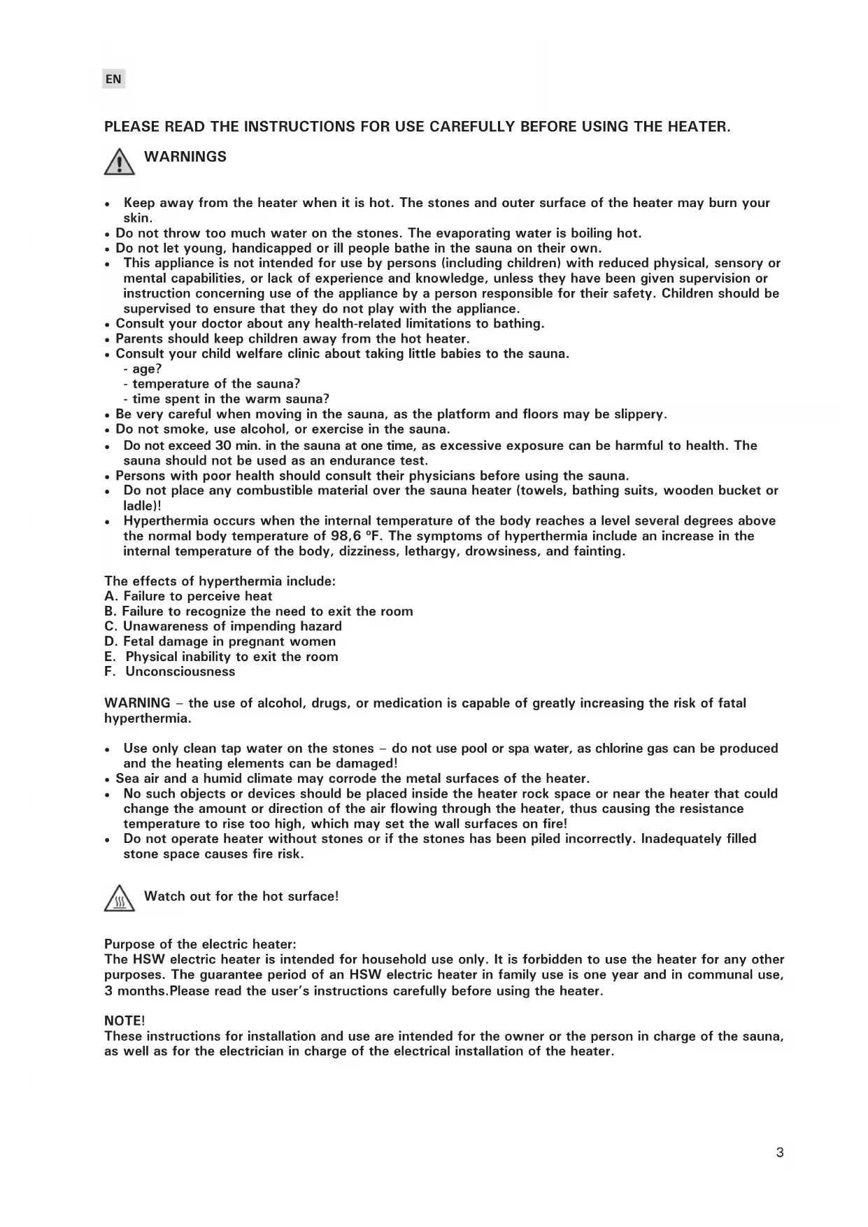 The HSW electric heater is intended for household use only. It is forbidden to use the heater for any other purposes. The guarantee period of an HSW electric heater in family use is one year and in communal use, 3 months. Please read the user's instructions carefully before using the heater.