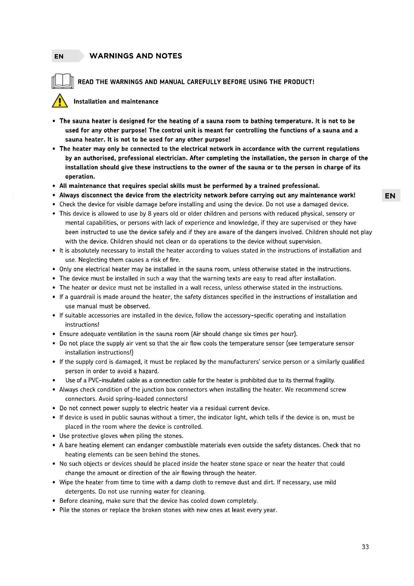 Maintenance: Due to large variation in temperature, the sauna stones disintegrate in use. Rearrange the stones at least once a year or even more often if the sauna is in frequent use. At the same time, remove any pieces of stones from the bottom of the heater and replace any disintegrated stones with new ones. By doing this, the heating capability of the heater stays optimal and the risk of overheating is avoided. Check occasionally whether the stone level has become lower. Make sure that the heating elements do not become visible over time. The stone level is likely to become lower in about two months after the stones have been placed. Heating of the Sauna When operating the heater for the first time, both the heater and the stones emit smell. To remove the smell, the sauna room needs to be efficiently ventilated. If the heater output is suitable for the sauna room, it will take about an hour for a properly insulated sauna to reach the required bathing temperature. The sauna stones normally reach the bathing temperature at the same time as the sauna room. A suitable temperature for the sauna room is about 65–80 °C. Using the Heater