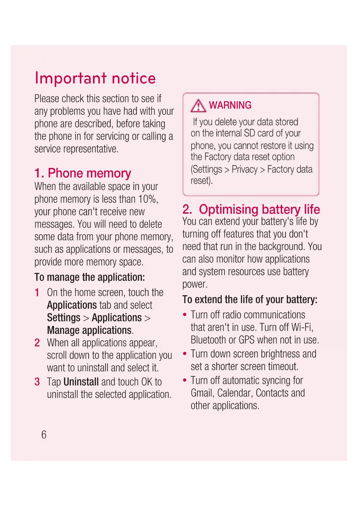 source OS If you install an open source OS on your phone and do not use the OS provided by the manufacturer, your phone may malfunction. WARNING If you install and use an OS other than the one provided by the manufacturer, your phone will not be covered by the warranty.8 WARNING To protect you r phone and personal data, only download applications from trusted sources such as Android Market. If some applications are incorrectly installed on your phone, your phone may not work properly, or serious errors may occur. You will need to remove these applications and all their data and settings from the phone.