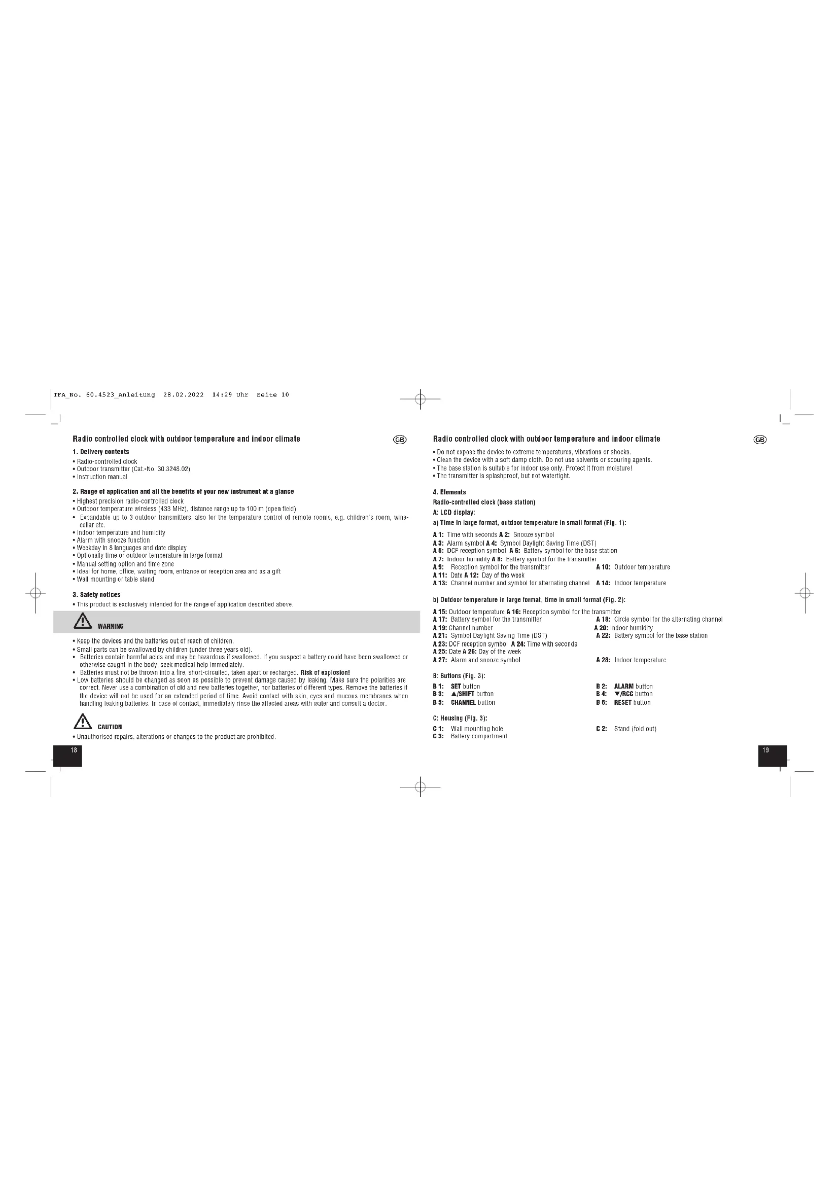 Radio-controlled clock (base station) A: LCD display: a) Time in large format, outdoor temperature in small format (Fig. 1): A 1: Time with seconds A 2: Snooze symbol A 3: Alarm symbol A 4: Symbol Daylight Saving Time (DST) A 5: DCF reception symbol A 6: Battery symbol for the base station A 7: Indoor humidity A 8: Battery symbol for the transmitter A 9: Reception symbol for the transmitter A 10: Outdoor temperature A 11: Date A 12: Day of the week A 13: Channel number and symbol for alternating channel A 14: Indoor temperature b) Outdoor temperature in large format, time in small format (Fig. 2): A 15: Outdoor temperature A 16: Reception symbol for the transmitter A 17: Battery symbol for the transmitter A 18: Circle symbol for the alternating channel A 19: Channel number A 20: Indoor humidity A 21: Symbol Daylight Saving Time (DST) A 22: Battery symbol for the base station A 23: DCF reception symbol A 24: Time with seconds A 25: Date A 26: Day of the week A 27: Alarm and snooze symbol A 28: Indoor temperature B: Buttons (Fig. 3): B 1: SET button B 2: ALARM button B 3: ▲/SHIFT button B 4: ▼/RCC button B 5: CHANNEL button B 6: RESET button C: Housing (Fig. 3): C 1: Wall mounting hole C 2: Stand (fold out) C 3: Battery compartment TFA_No. 60.4523_Anleitung 28.02.2022 14:29 Uhr Seite 102120 Radio controlled clock with outdoor temperature and indoor climate