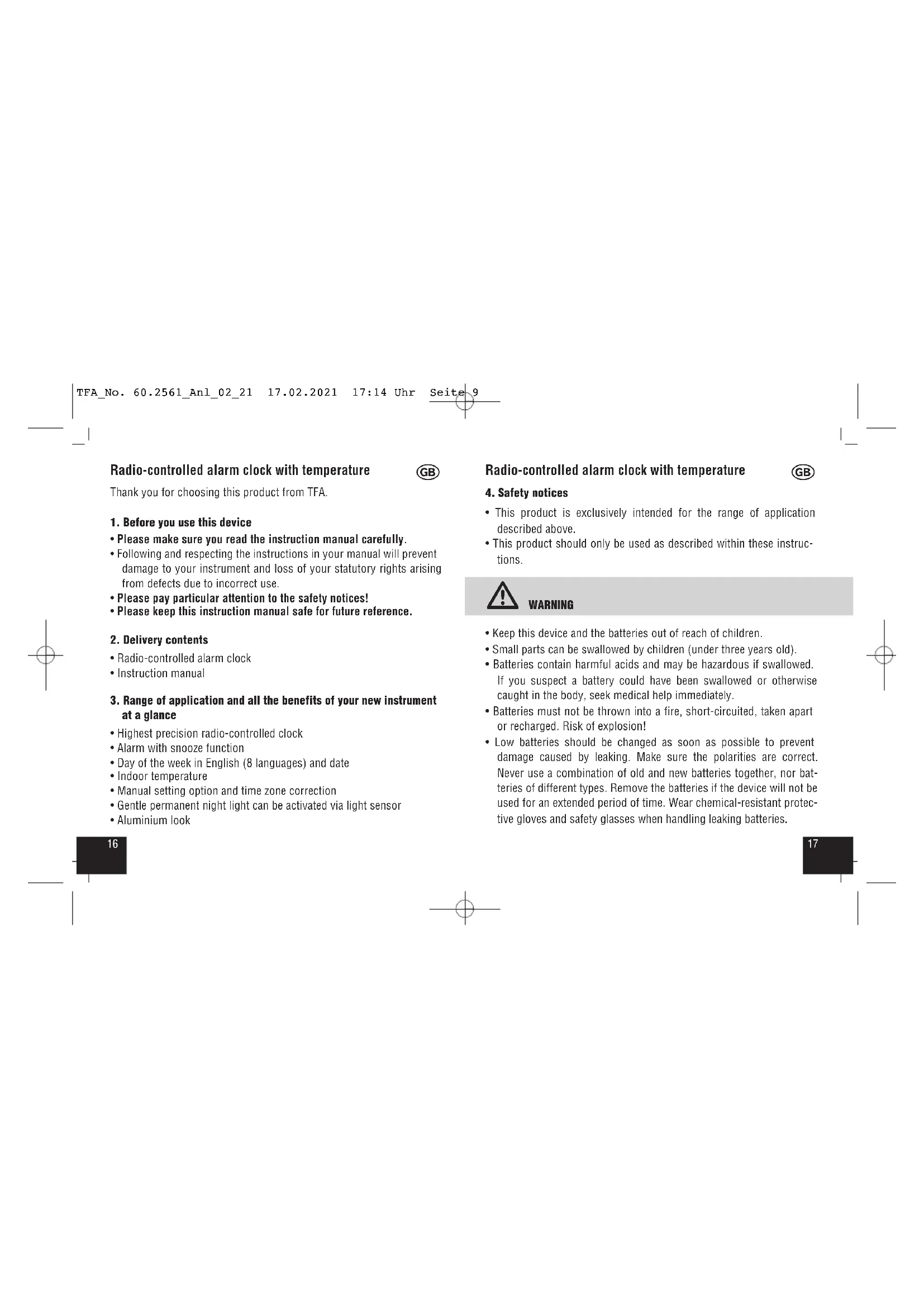 - Make sure to avoid the vicinity of any source of interference such as computer screens, TV sets or solid metal objects. Within concrete walls (reinforced with steel) such as basements, the received signal is naturally weakened. In extreme cases, please place the unit close to a window to improve reception. TFA_No. 60.2561_Anl_02_21 17.02.2021 17:14 Uhr Seite 11Radio-controlled alarm clock with temperature