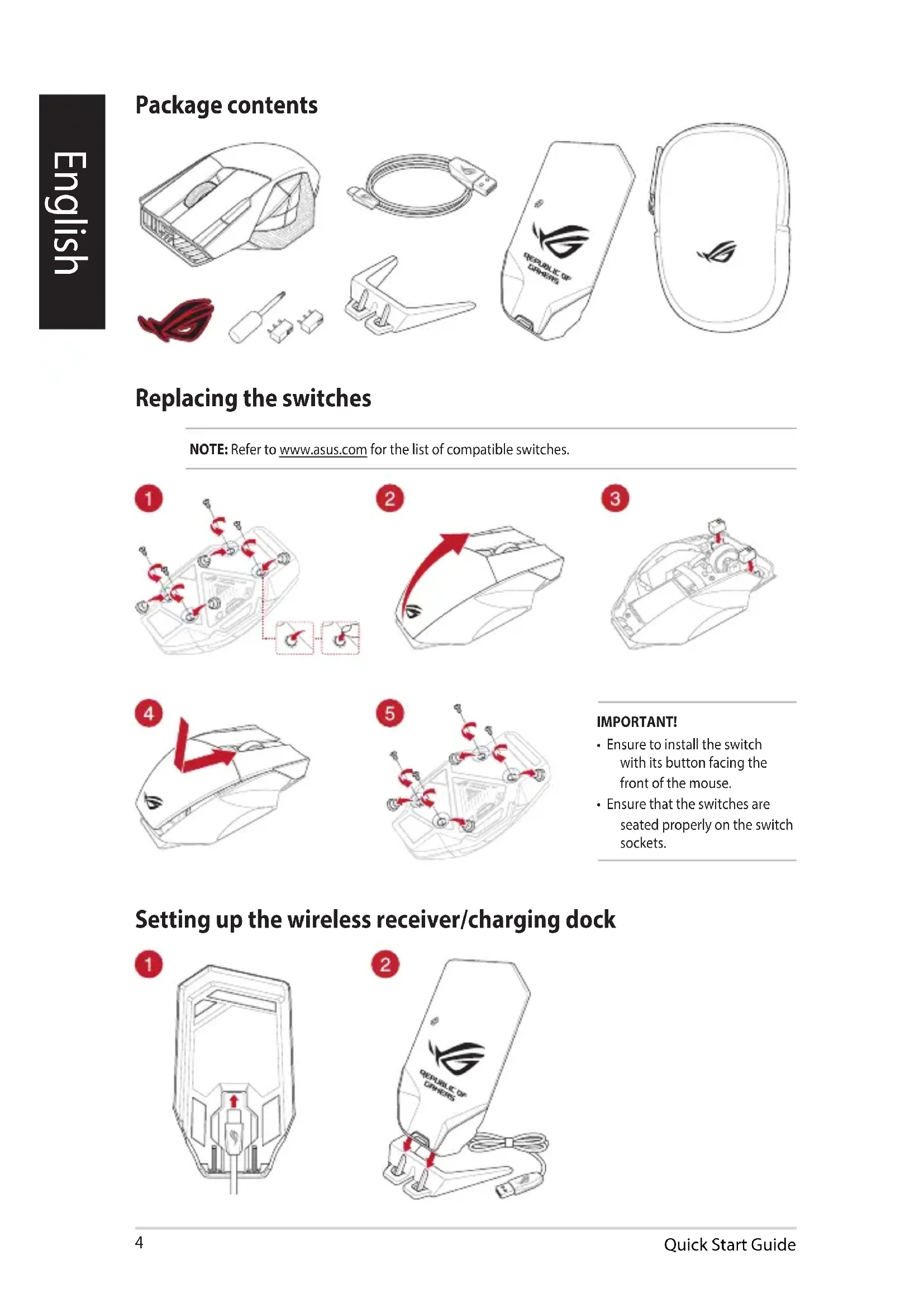 Package contents Replacing the switches NOTE: Refer to www.asus.com for the list of compatible switches. Setting up the wireless receiver/charging dock IMPORTANT!
