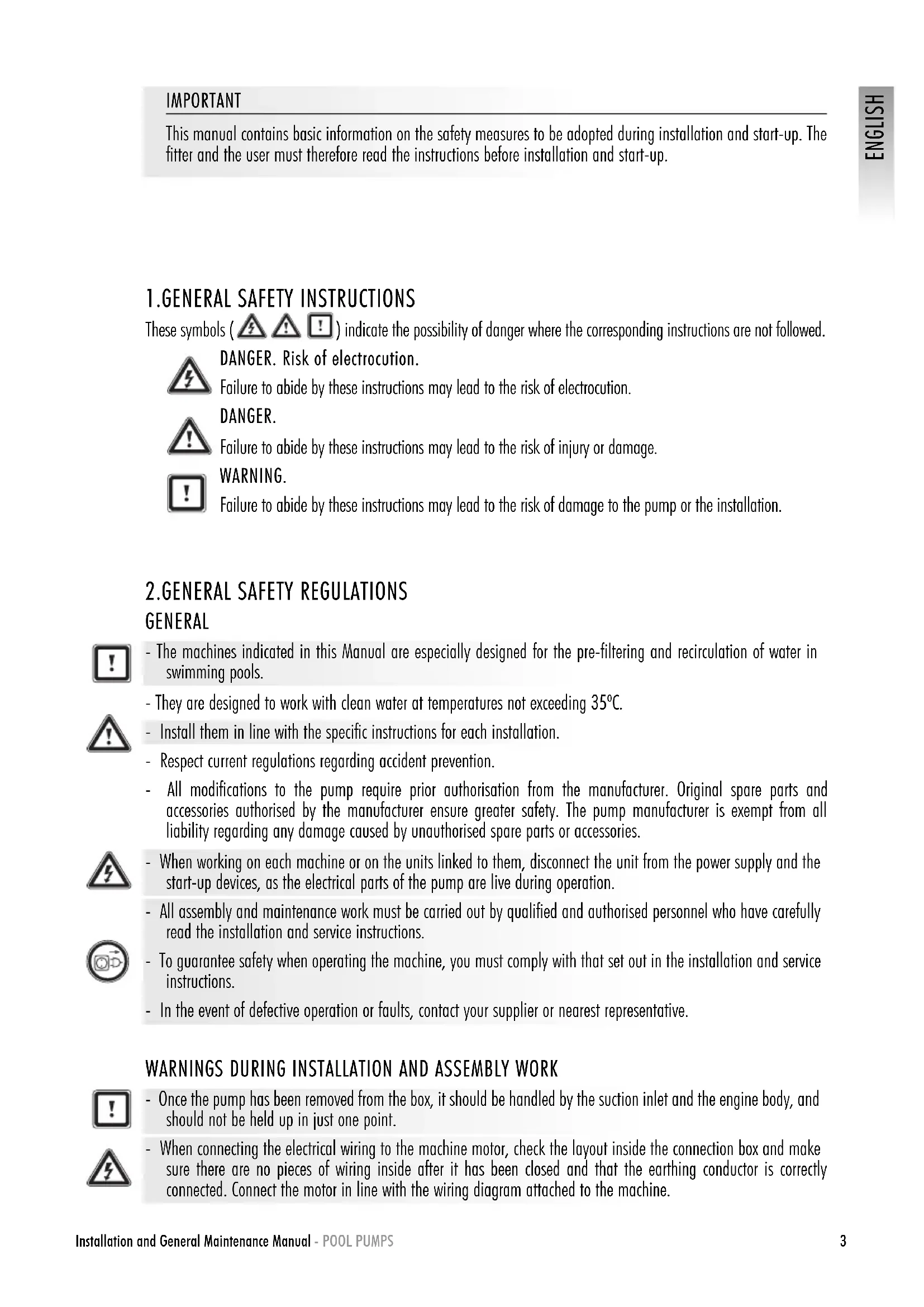 N.I.F.: A-082462743 ENGLISH Installation and General Maintenance Manual - POOL PUMPS IMPORTANT This manual contains basic information on the safety measures to be adopted during installation and start-up. The fitter and the user must therefore read the instructions before installation and start-up.