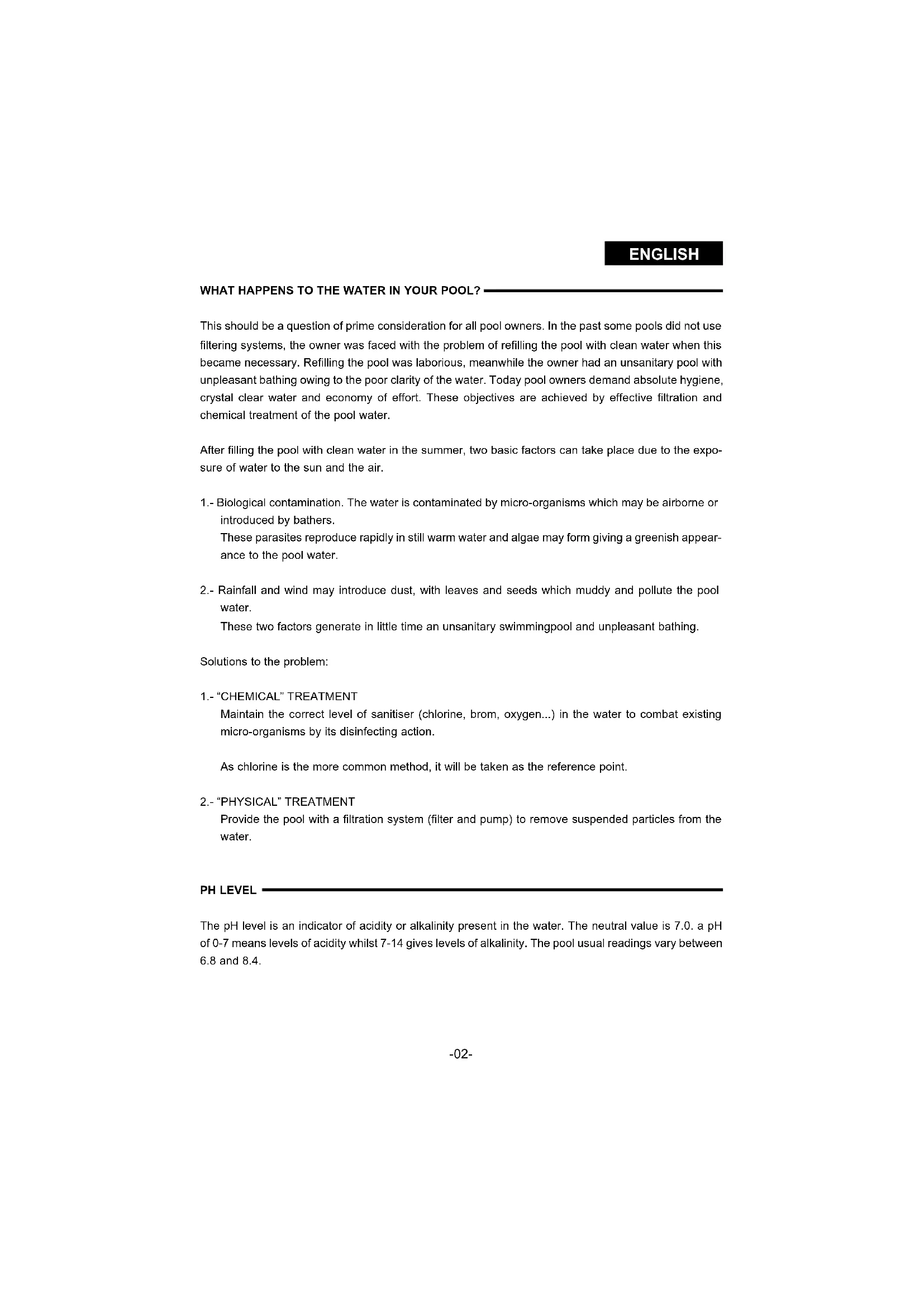 WHAT HAPPENS TO THE WATER IN YOUR POOL? This should be a question of prime consideration for all pool owners. In the past some pools did not use filtering systems, the owner was faced with the problem of refilling the pool with clean water when this became necessary. Refilling the pool was laborious, meanwhile the owner had an unsanitary pool with unpleasant bathing owing to the poor clarity of the water. Today pool owners demand absolute hygiene, crystal clear water and economy of effort. These objectives are achieved by effective filtration and chemical treatment of the pool water. After filling the pool with clean water in the summer, two basic factors can take place due to the expo- sure of water to the sun and the air. 1.- Biological contamination. The water is contaminated by micro-organisms which may be airborne or introduced by bathers. These parasites reproduce rapidly in still warm water and algae may form giving a greenish appear- ance to the pool water. 2.- Rainfall and wind may introduce dust, with leaves and seeds which muddy and pollute the pool water. These two factors generate in little time an unsanitary swimmingpool and unpleasant bathing. Solutions to the problem: