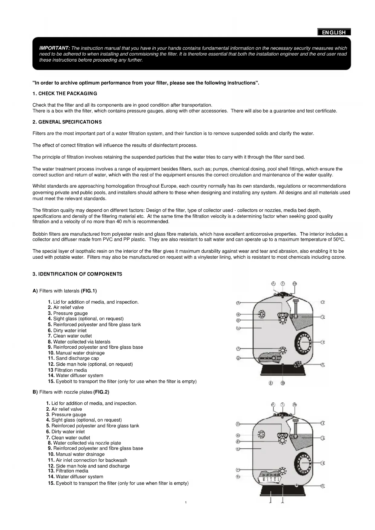 Filters are the most important part of a water filtration system, and their function is to remove suspended solids and clarify the water. The effect of correct filtration will influence the results of disinfectant process. The principle of filtration involves retaining the suspended particles that the water tries to carry with it through the filter sand bed. The water treatment process involves a range of equipment besides filters, such as; pumps, chemical dosing, pool shell fittings, which ensure the correct suction and return of water, which with the rest of the equipment ensures the correct circulation and maintenance of the water quality. Whilst standards are approaching homologation throughout Europe, each country normally has its own standards, regulations or recommendations governing private and public pools, and installers should adhere to these when designing and installing any system. All designs and all materials used must meet the relevant standards. The filtration quality may depend on different factors: Design of the filter, type of collector used - collectors or nozzles, media bed depth, specifications and density of the filtering material etc. At the same time the filtration velocity is a determining factor when seeking good quality filtration and a velocity of no more than 40 m/h is recommended. Bobbin filters are manufactured from polyester resin and glass fibre materials, which have excellent anticorrosive properties. The interior includes a collector and diffuser made from PVC and PP plastic. They are also resistant to salt water and can operate up to a maximum temperature of 50ºC. The special layer of isopthalic resin on the interior of the filter gives it maximum durability against wear and tear and abrasion, also enabling it to be used with potable water. Filters may also be manufactured on request with a vinylester lining, which is resistant to most chemicals including ozone.