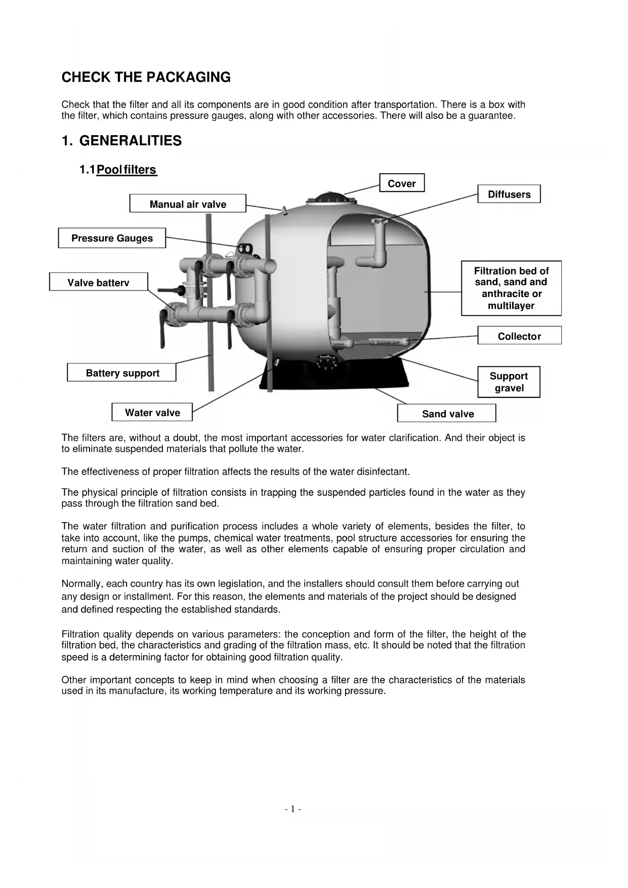 The filters are, without a doubt, the most important accessories for water clarification. And their object is to eliminate suspended materials that pollute the water. The effectiveness of proper filtration affects the results of the water disinfectant. The physical principle of filtration consists in trapping the suspended particles found in the water as they pass through the filtration sand bed. The water filtration and purification process includes a whole variety of elements, besides the filter, to take into account, like the pumps, chemical water treatments, pool structure accessories for ensuring the return and suction of the water, as well as other elements capable of ensuring proper circulation and maintaining water quality. Normally, each country has its own legislation, and the installers should consult them before carrying out any design or installment. For this reason, the elements and materials of the project should be designed and defined respecting the established standards. Filtration quality depends on various parameters: the conception and form of the filter, the height of the filtration bed, the characteristics and grading of the filtration mass, etc. It should be noted that the filtration speed is a determining factor for obtaining good filtration quality. Other important concepts to keep in mind when choosing a filter are the characteristics of the materials used in its manufacture, its working temperature and its working pressure. Cover Water valve Pressure Gauges