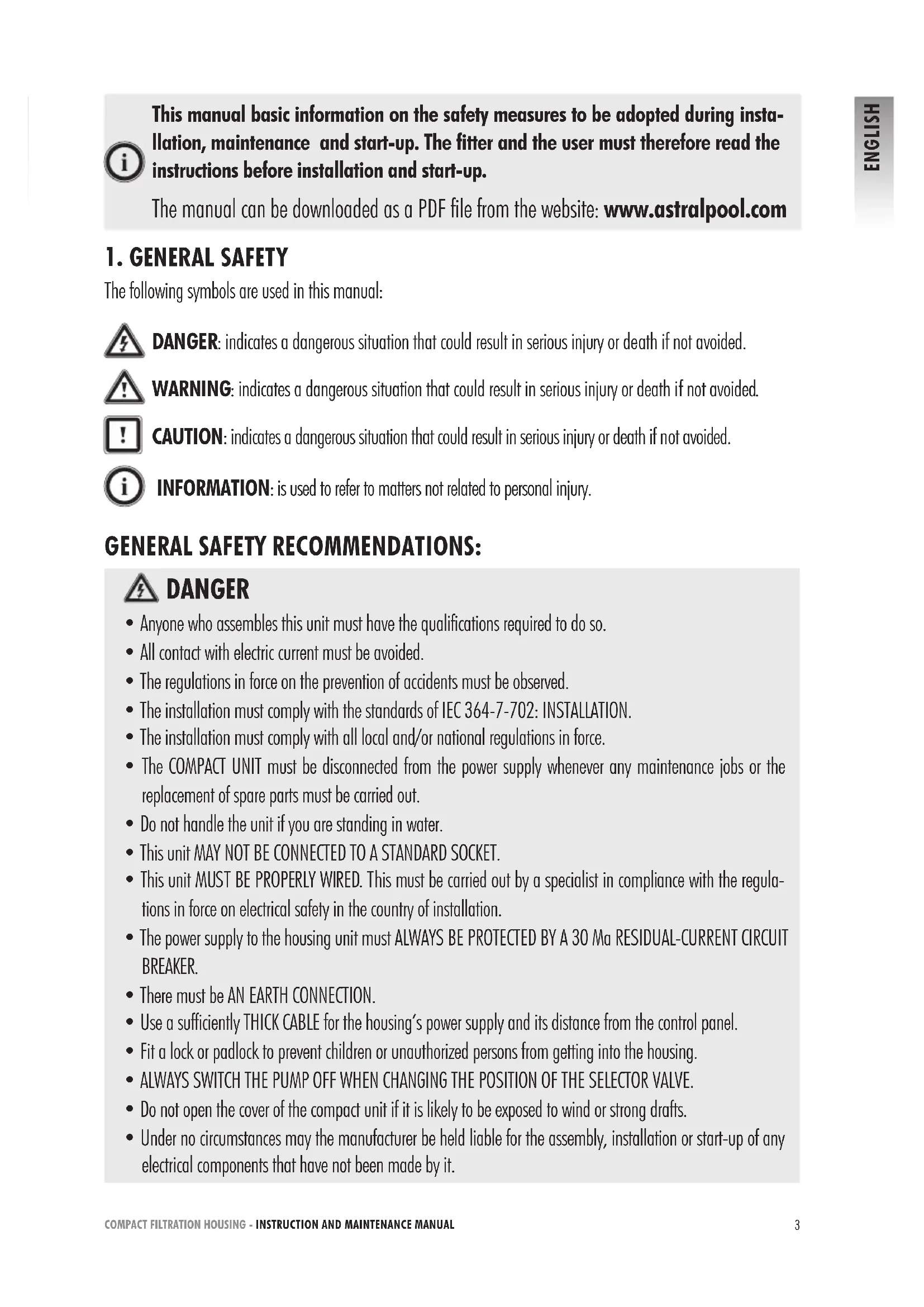 ENGLISH This manual basic information on the safety measures to be adopted during insta- llation, maintenance and start-up. The tter and the user must therefore read the instructions before installation and start-up. The manual can be downloaded as a PDF file from the website: www.astralpool.com DANGER