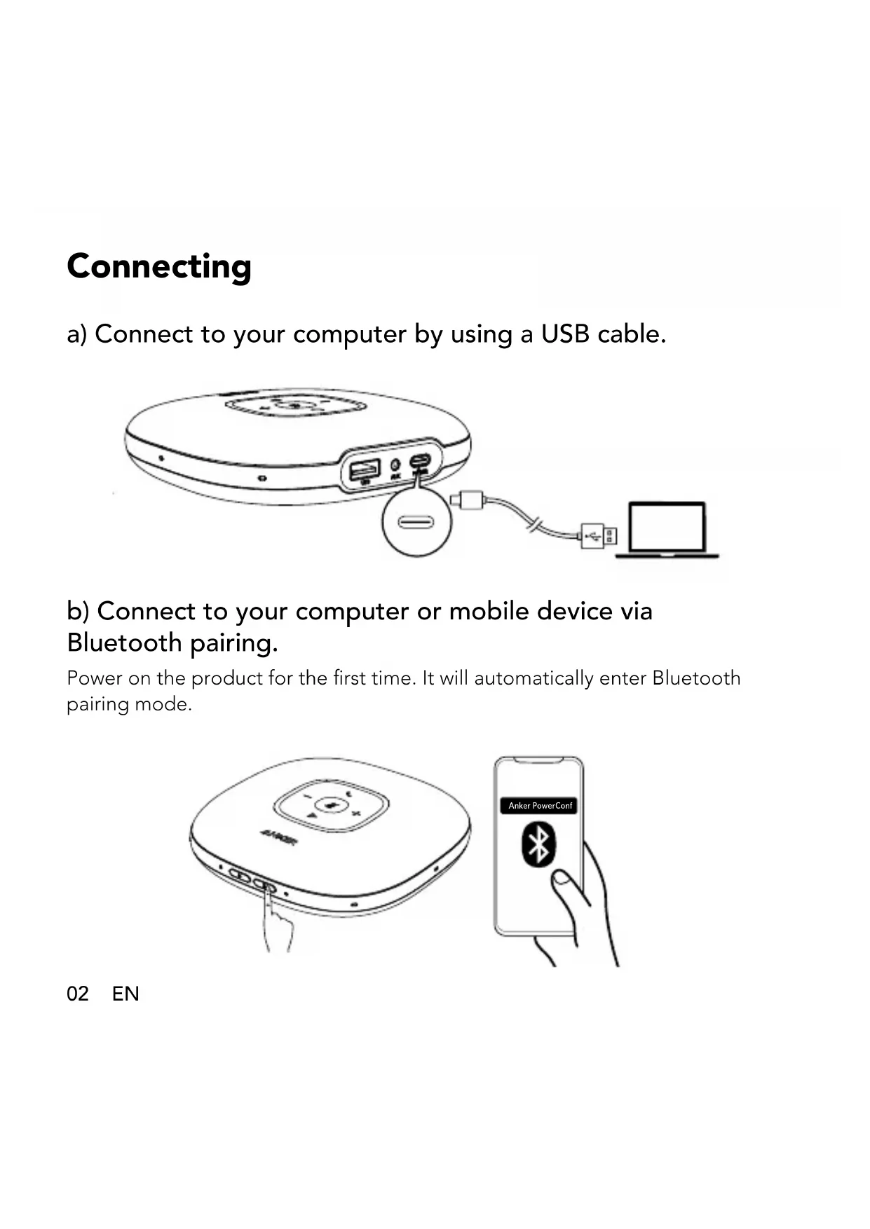 Power LED02 EN Connecting a) Connect to your computer by using a USB cable. b) Connect to your computer or mobile device via Bluetooth pairing. Power on the product for the rst time. It will automatically enter Bluetooth pairing mode. Anker PowerConfEN 03 PressEnter Bluetooth pairing mode Flashes blue Bluetooth pairing Steady blue Bluetooth connected