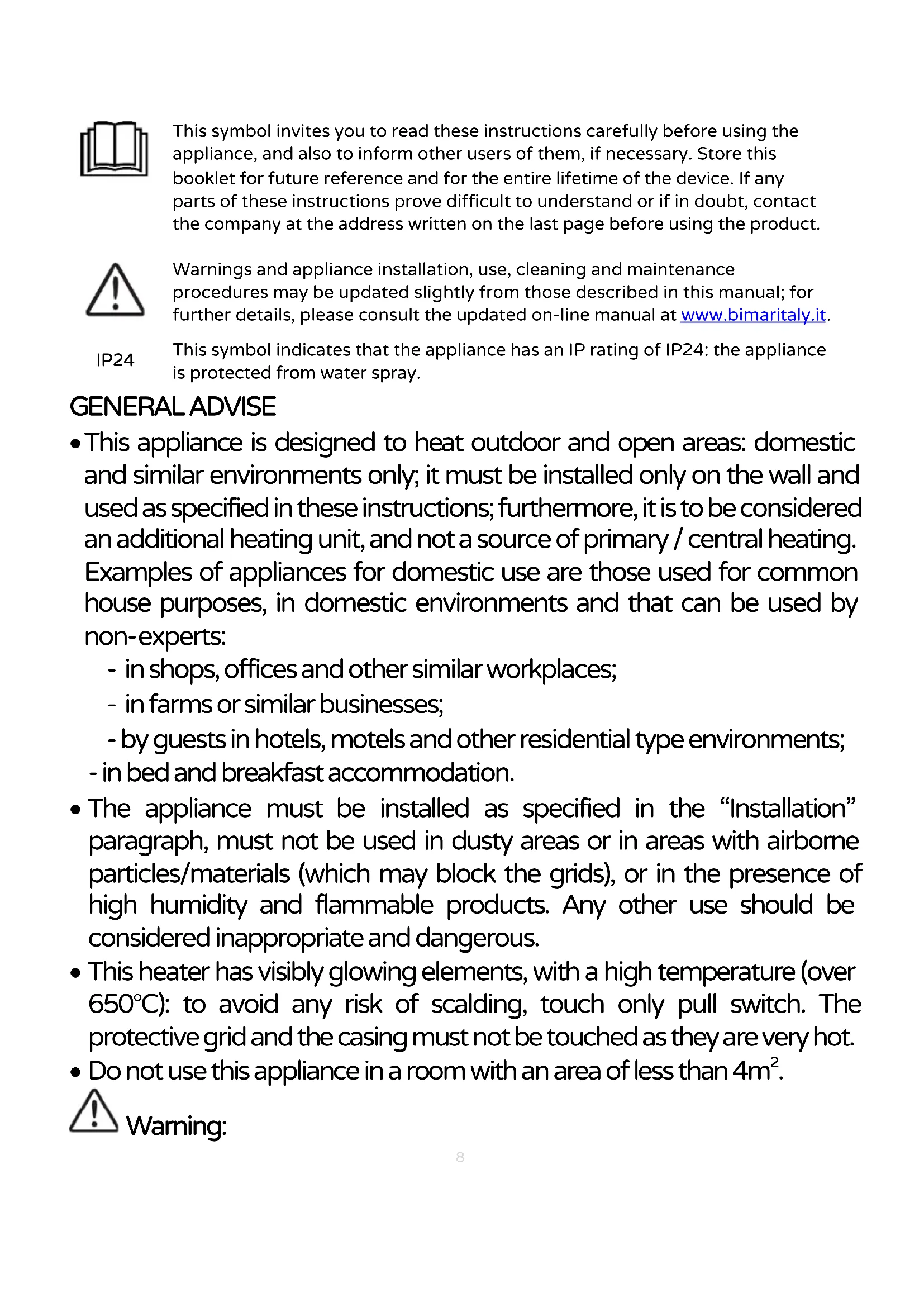 IP24 This symbol invites you to read these instructions carefully before using the appliance, and also to inform other users of them, if necessary. Store this booklet for future reference and for the entire lifetime of the device. If any parts of these instructions prove difficult to understand or if in doubt, contact the company at the address written on the last page before using the product. Warnings and appliance installation, use, cleaning and maintenance procedures may be updated slightly from those described in this manual; for further details, please consult the updated on-line manual at www.bimaritaly.it.