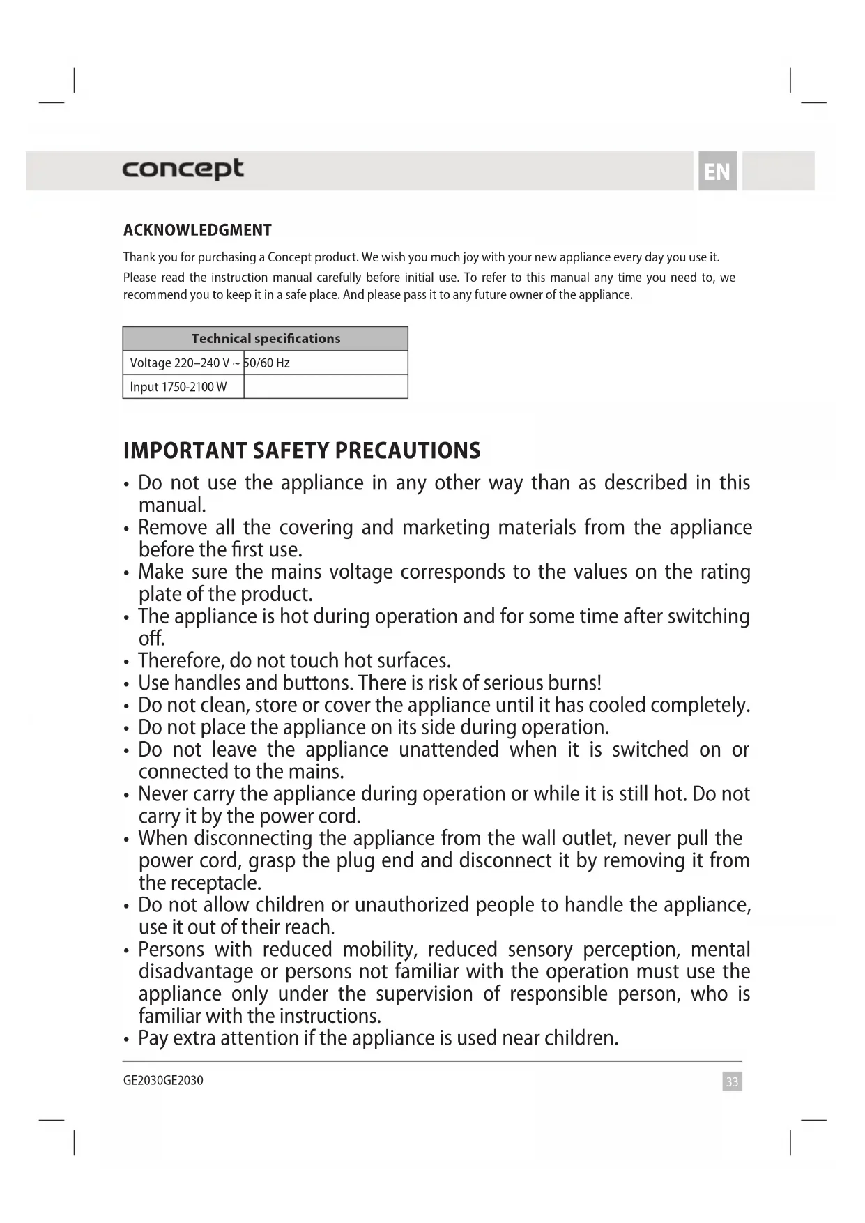 GE2030GE2030 ACKNOWLEDGMENT Thank you for purchasing a Concept product. We wish you much joy with your new appliance every day you use it. Please read the instruction manual carefully before initial use. To refer to this manual any time you need to, we recommend you to keep it in a safe place. And please pass it to any future owner of the appliance. Technical specifications Voltage 220–240 V ~ 50/60 Hz Input 1750-2100 W