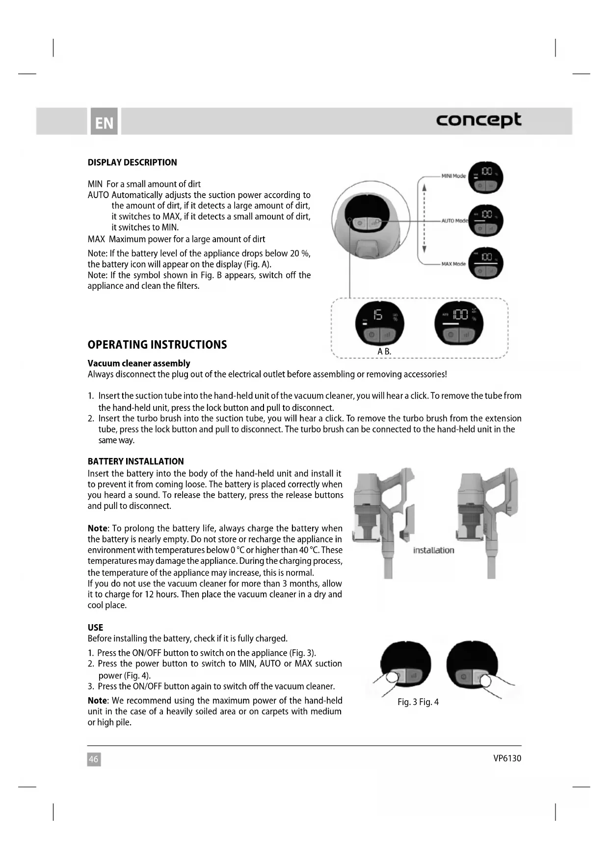 VP6130 DISPLAY DESCRIPTION MIN For a small amount of dirt AUTO Automatically adjusts the suction power according to the amount of dirt, if it detects a large amount of dirt, it switches to MAX, if it detects a small amount of dirt, it switches to MIN. MAX Maximum power for a large amount of dirt Note: If the battery level of the appliance drops below 20 %, the battery icon will appear on the display (Fig. A). Note: If the symbol shown in Fig. B appears, switch off the appliance and clean the filters. OPERATING INSTRUCTIONS Vacuum cleaner assembly Always disconnect the plug out of the electrical outlet before assembling or removing accessories!