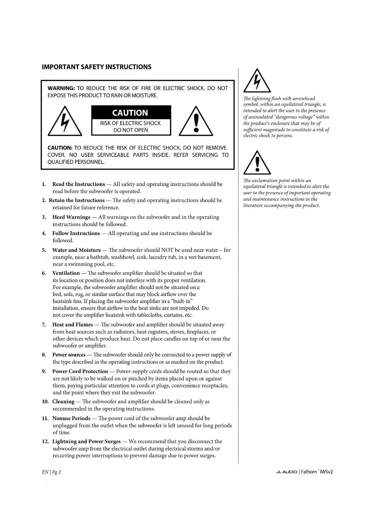 subwoofer amp from the electrical outlet during electrical storms and/or recurring power interruptions to prevent damage due to power surges. e lightning ash with arrowhead symbol, within an equilateral triangle, is intended to alert the user to the presence of uninsulated “dangerous voltage” within the product’s enclosure that may be of sucient magnitude to constitute a risk of electric shock to persons. e exclamation point within an equilateral triangle is intended to alert the user to the presence of important operating and maintenance instructions in the literature accompanying the product.| Fathom