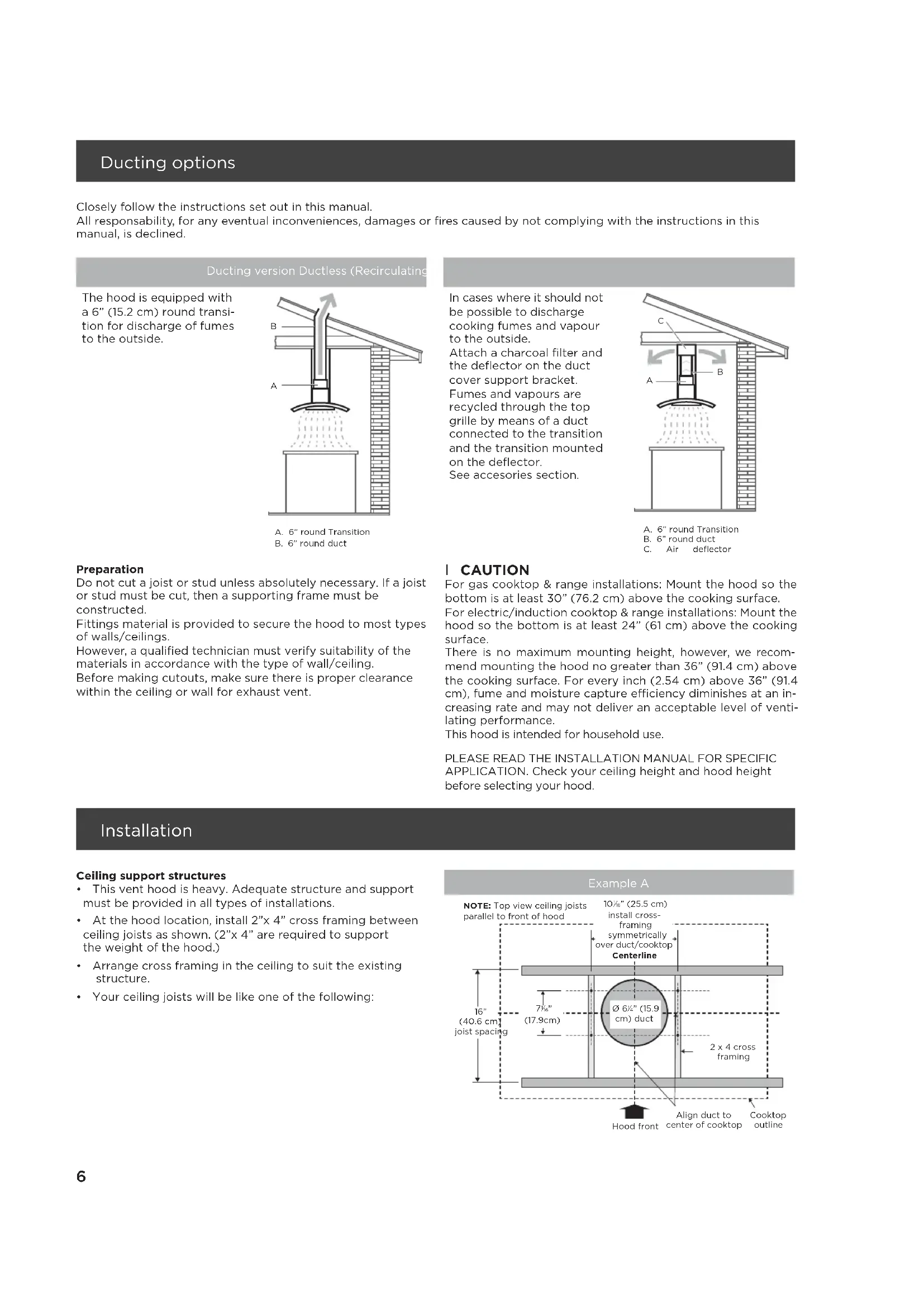 A. 6” round Transition B. 6” round duct C. Air deflector Preparation Do not cut a joist or stud unless absolutely necessary. If a joist or stud must be cut, then a supporting frame must be constructed. Fittings material is provided to secure the hood to most types of walls/ceilings. However, a qualified technician must verify suitability of the materials in accordance with the type of wall/ceiling. Before making cutouts, make sure there is proper clearance within the ceiling or wall for exhaust vent. I CAUTION For gas cooktop & range installations: Mount the hood so the bottom is at least 30” (76.2 cm) above the cooking surface. For electric/induction cooktop & range installations: Mount the hood so the bottom is at least 24” (61 cm) above the cooking surface. There is no maximum mounting height, however, we recom- mend mounting the hood no greater than 36” (91.4 cm) above the cooking surface. For every inch (2.54 cm) above 36” (91.4 cm), fume and moisture capture eciency diminishes at an in- creasing rate and may not deliver an acceptable level of venti- lating performance. This hood is intended for household use. PLEASE READ THE INSTALLATION MANUAL FOR SPECIFIC APPLICATION. Check your ceiling height and hood height before selecting your hood. Installation Ceiling support structures đƫ This vent hood is heavy. Adequate structure and support must be provided in all types of installations. đƫ At the hood location, install 2”x 4” cross framing between ceiling joists as shown. (2”x 4” are required to support the weight of the hood.) đƫ Arrange cross framing in the ceiling to suit the existing structure. đƫ Your ceiling joists will be like one of the following: Example A NOTE: Top view ceiling joists parallel to front of hood