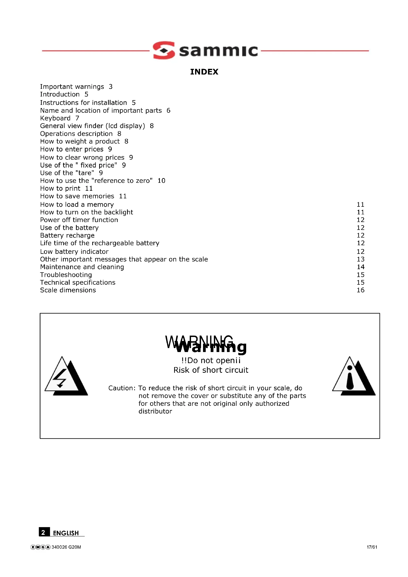 INDEX Important warnings 3Introduction 5Instructions for installation 5Name and location of important parts 6 Keyboard 7General view finder (lcd display) 8Operations description 8How to weight a product 8How to enter prices 9How to clear wrong prices 9Use of the " fixed price" 9Use of the "tare" 9How to use the "reference to zero" 10 How to print 11How to save memories 11How to load a memory 11How to turn on the backlight 11Power off timer function 12Use of the battery 12Battery recharge 12Life time of the rechargeable battery 12 Low battery indicator 12Other important messages that appear on the scale 13 Maintenance and cleaning 14Troubleshooting 15Technical specifications 15Scale dimensions 16 WARNING