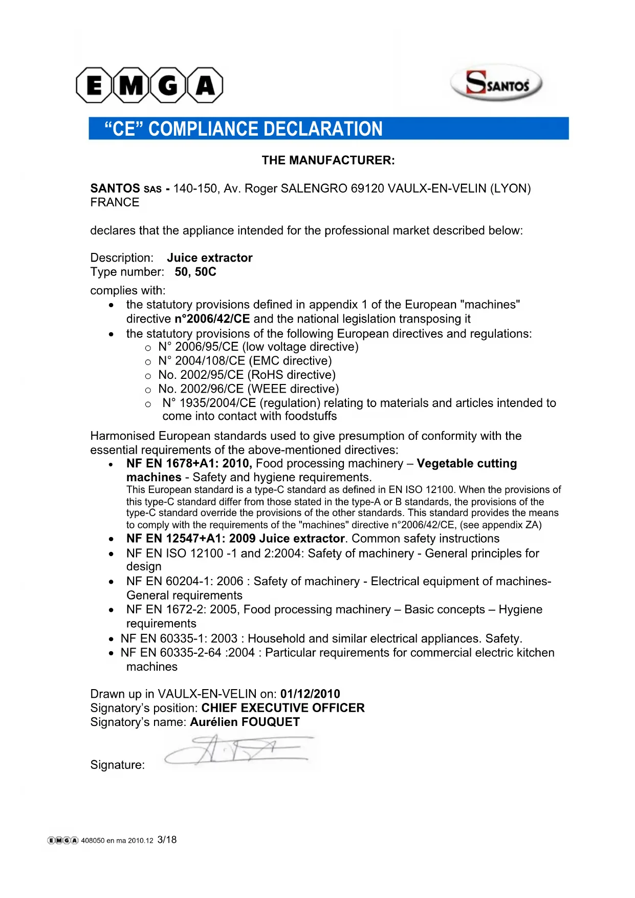 THE MANUFACTURER: SANTOS SAS - 140-150, Av. Roger SALENGRO 69120 VAULX-EN-VELIN (LYON) FRANCE declares that the appliance intended for the professional market described below: Description: Juice extractor Type number: 50, 50C complies with: the statutory provisions defined in appendix 1 of the European "machines" directive n°2006/42/CE and the national legislation transposing it the statutory provisions of the following European directives and regulations: o N° 2006/95/CE (low voltage directive) o N° 2004/108/CE (EMC directive) o No. 2002/95/CE (RoHS directive) o No. 2002/96/CE (WEEE directive) o N° 1935/2004/CE (regulation) relating to materials and articles intended to come into contact with foodstuffs Harmonised European standards used to give presumption of conformity with the essential requirements of the above-mentioned directives: NF EN 1678+A1: 2010, Food processing machinery – Vegetable cutting machines - Safety and hygiene requirements. This European standard is a type-C standard as defined in EN ISO 12100. When the provisions of this type-C standard differ from those stated in the type-A or B standards, the provisions of the type-C standard override the provisions of the other standards. This standard provides the means to comply with the requirements of the "machines" directive n°2006/42/CE, (see appendix ZA) NF EN 12547+A1: 2009 Juice extractor. Common safety instructions NF EN ISO 12100 -1 and 2:2004: Safety of machinery - General principles for design NF EN 60204-1: 2006 : Safety of machinery - Electrical equipment of machines- General requirements NF EN 1672-2: 2005, Food processing machinery – Basic concepts – Hygiene requirements NF EN 60335-1: 2003 : Household and similar electrical appliances. Safety. NF EN 60335-2-64 :2004 : Particular requirements for commercial electric kitchen machines Drawn up in VAULX-EN-VELIN on: 01/12/2010 Signatory’s position: CHIEF EXECUTIVE OFFICER Signatory’s name: Aurélien FOUQUET Signature: 408050 en ma 2010.12 3/1898150 US 4.3 - 12 2010 www.santos.fr 4/18 IMPORTANT SAFEGUARDS When using, cleaning or maintaining the machine, always follow these instructions: Read all instructions Note: You will find it easier to understand the next few paragraphs if you refer to the diagrams at the end of this manual.