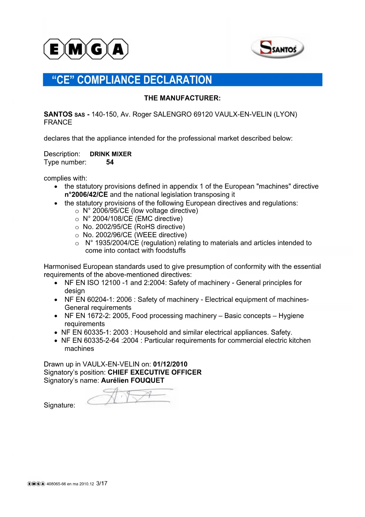 THE MANUFACTURER: SANTOS SAS - 140-150, Av. Roger SALENGRO 69120 VAULX-EN-VELIN (LYON) FRANCE declares that the appliance intended for the professional market described below: Description: DRINK MIXER Type number: 54 complies with: the statutory provisions defined in appendix 1 of the European "machines" directive n°2006/42/CE and the national legislation transposing it the statutory provisions of the following European directives and regulations: o N° 2006/95/CE (low voltage directive) o N° 2004/108/CE (EMC directive) o No. 2002/95/CE (RoHS directive) o No. 2002/96/CE (WEEE directive) o N° 1935/2004/CE (regulation) relating to materials and articles intended to come into contact with foodstuffs Harmonised European standards used to give presumption of conformity with the essential requirements of the above-mentioned directives: NF EN ISO 12100 -1 and 2:2004: Safety of machinery - General principles for design NF EN 60204-1: 2006 : Safety of machinery - Electrical equipment of machines- General requirements NF EN 1672-2: 2005, Food processing machinery – Basic concepts – Hygiene requirements NF EN 60335-1: 2003 : Household and similar electrical appliances. Safety. NF EN 60335-2-64 :2004 : Particular requirements for commercial electric kitchen machines Drawn up in VAULX-EN-VELIN on: 01/12/2010 Signatory’s position: CHIEF EXECUTIVE OFFICER Signatory’s name: Aurélien FOUQUET Signature: 408065-66 en ma 2010.12 3/1798154 US 2.2 - 12 2010 4 / 17 www.santos.fr IMPORTANT SAFEGUARDS When using, cleaning or maintaining the machine, always follow these instructions: Read all instructions IMPROPER USE