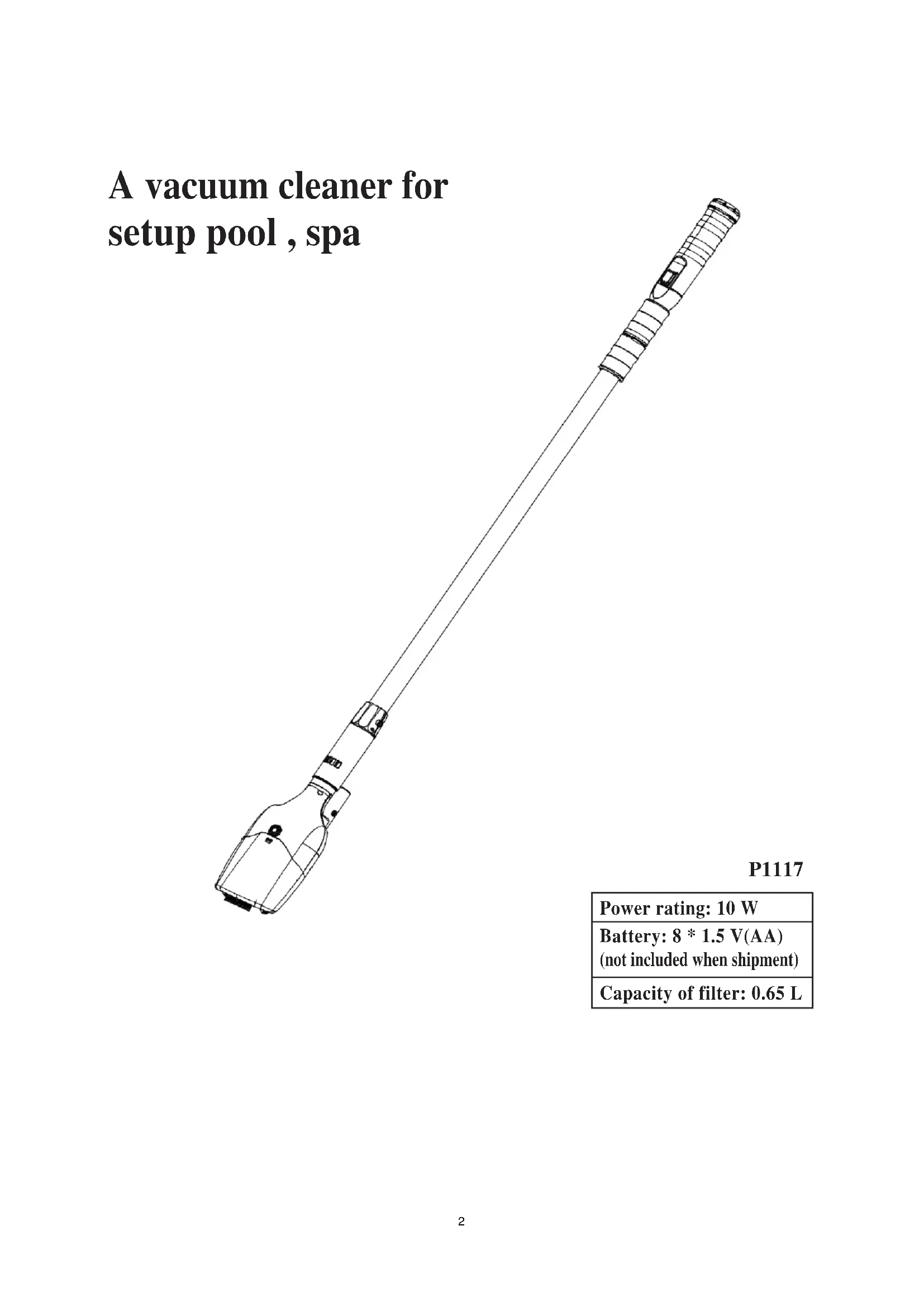 HIMVCB08.18 Instruction Manual - Manual de Instrucciones Manuel d´instructions - Bedienungsanleitung Manuale delle instruzioni - Handleiding met instructies Manual de instruções We reserve to change all of part of the articles or contents of this document, without prior notice. Nos reservamos el derecho de cambiar total o parcialmente las características de nuestros artículos o contenido de este documento sin previo aviso. Nous nous réservons le droit de modifier totalement oru en partie les caracteristiques de nos articles ou le contenu de ce document san pré avis. Wir behalten uns das recht vor die eigenschaften unserer produkte oder den inhalt diese prospektes teilweise oder wollstanding, ohne vorherige benachichtigung su andern. Ci riservamo il diritto di cambiare totalemente o parzialmente le caratteristiche tecniche dei nostri prodotti ed il contenuto di questo documento senza nessum preavviso. Wij behouden ons het recht voor geheel of gedeeltelijk de kenmerken van onze artikelen of de inhouk van deze handleiding zonder voorafgaand bericht te wijzigen. Reservamo-nos no dereito de alterar, total ou parcialmente as caracteristicas os nossos artigos ou o conteúdo deste documento sem aviso prévio. www.gre.es DISTRIBUTED BY / DISTRIBUIDO POR / DISTRIBUÉ PAR / VERTRIEB DURCH / DISTRIBUITO DA / DISTRIBUÍDO POR: MANUFACTURAS GRE, S.A. ARITZ BIDEA Nº 57 BELAKO INDUSTRIALDEA, APARTADO 69 - 48100 MUNGUIA (VIZCAYA) ESPAÑA Nº Reg. Ind. 48-06762 MADE IN CHINA / FABRICADO EN CHINA / FABRIQUÉ AU CHINE / HERGESTELLT IN CHINA / PRODOTTO IN CHINA / FABRICADO NA RPCA vacuum cleaner for setup pool , spa P1117 Power rating: 10 W Battery: 8 * 1.5 V(AA) (not included when shipment) Capacity of filter: 0.65 L 2Please read all instructions and safety guidelines contained in this manual to keep your STICK VAC working well. WARNING! To reduce the risk of fire ,electrical shock ,injury and damage to the cleaner, pleaseadheretothefollowingwarnings: Always keep the cleaner’s battery cap firmly closed during operation to prevent water entering, water entering the chamber will ruin the components of your unit . Never leave STICK VAC in the water when it is notrunning. The cleaner is designed for underwater application ONLY and should be submerged during use. idling is forbidden, otherwise it may damage the cleaner. Do not attempt to use the cleaner to clean anything other than above-ground spools hot tub or spa. Thecleanercancreatesuctionunderwaterandtherefore hair, loose clothing, fingers and other parts of the body should be kept away from the openings and moving parts. Store the cleaner in a clean and dry place, out of direct sunlight and away from extreme temperatures. Avoid picking up hard shar pobjects with the suction head, asitmay damage the filter inside. Do not use to pick up toxic, flammable or combustible substances , or operate in the presence of explosive or flammable flumes . Do not insert objects into the unit forcibly. Make sure that cleaner is off before cleaning the unit. Make sure that the filter is installed correctly before using. This appliance can be used by children aged from 12 years and above and persons with reduced physical, sensory or mental capabilities or lack of experience and knowledge if they have been given supervision or instruction concerning use of the appliance in a safe way and understand the hazards involved.Children shall notplaywith 3the appliance. Cleaning and user maintenance shall not be made by children without supervision. It is not a TOY.Children should besupervisedtoensurethattheydo not play with cleaner and its accessories. Never allow children to operate this product. Keep this cleaner and its accessories away from children. DO NOT use this cleaner if any damage is found. Itisnecessarytochangepartsorassembliesasquicklyaspossibleif theybecomedamaged. Only use parts certified by the distributor or manufacturer. DO NOT operate the cleaner when people/pets are in the water. Never attempt in any way to disassemble your cleaner on your own. Under no circumstances should you attempt to disassemble the cleaner and replace the impeller, motor by yourself. Suitable for pools and spa till water depth 120CM, minimum water depth is 35CM. Switch handle mustn’t be submerged in water ,water entering The chamber will ruin the cleaner. Please ensure that the filter bag is properly installed before using. Operating water temperature:4 C(39.2 F)-35 C(95 F). CAUTION! Use original accessories delivered with this product. It is not recommended to use this cleaner with another cleaner simultaneously. If you do not use the suction head part, you should take it off the electric cleaner. Above warning and cautions are not intended to incorporate all possible instances for risks and/or severe injury. Pool/spa owners should always exercise intensive caution and common sense when operating the cleaner. 4Product components STICK VAC consists of six main parts: (1)Suction head (2)The filter bag (3)The main body (4) The telescopic poles (5)The battery holder(6)The battery compartment cap (1) (2) (3) (4) (AA) (Not included) (5) (6) Basic Usage The STICK VAC is not intended for use for inground swimming pools, it is only designed for cleaning for above-ground swimming pools, hot tubs and spa . Improper uses may result in damaging to the cleaner and willnotunder warranty. WARNING! (1) The cleaner is designed for underwater aapplication only, please submerged during use, otherwise it may damage the cleaner (2) Suitable for pools and spa till water depth 120CM, minimum water depthis 35CM. (3) Sw itch handle mustn’t be submerged in water ,water entering thechamberwillruinthe cleaner. (4) Pl ease ensure that the filter bag is properly installed before using. (5) Operating water temperature:4 C(39.2 F)-35 C(95 F).