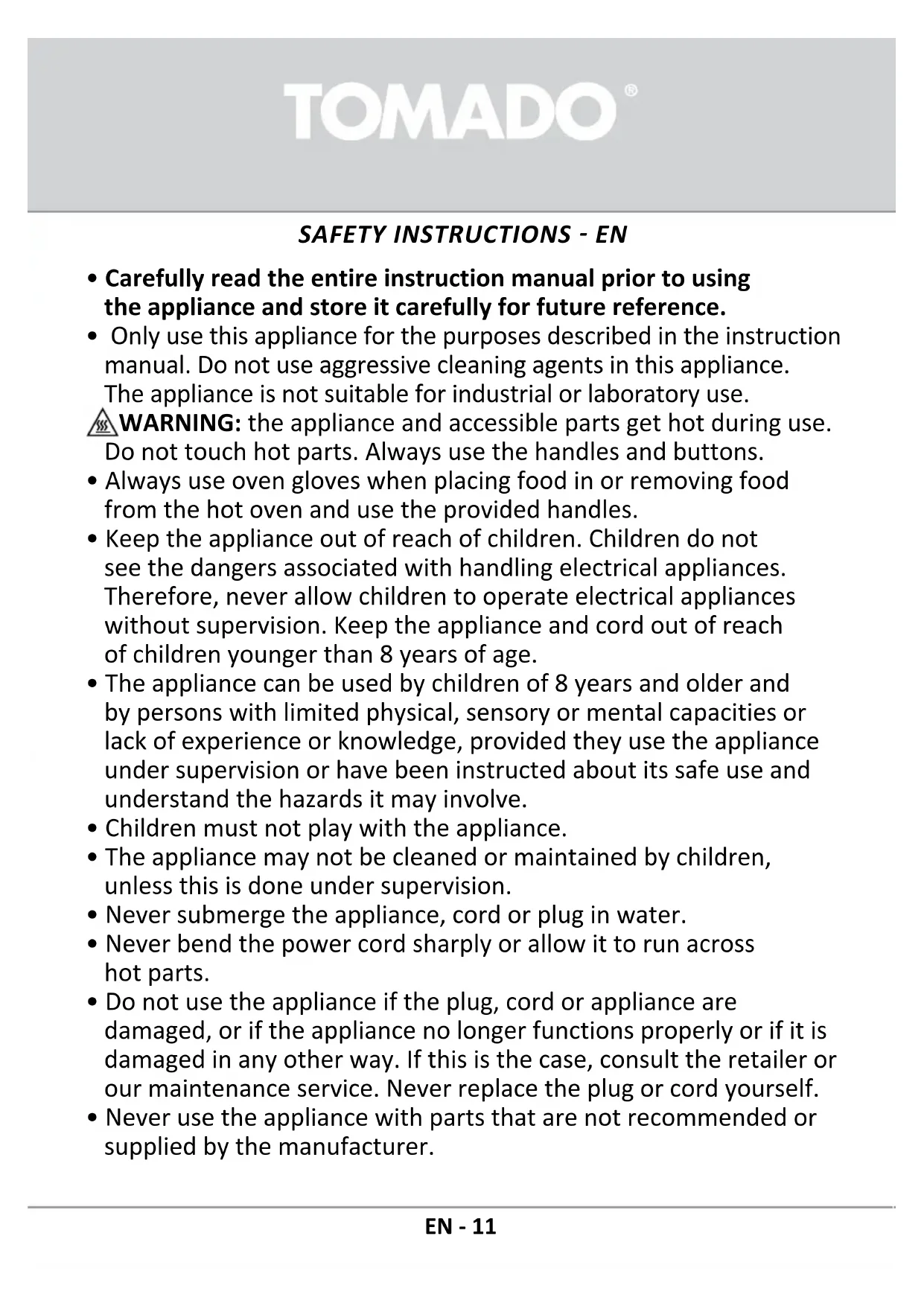 A 24 month warranty is provided for this product. Your warranty is valid if the product has been used in accordance with the user instructions and for the purpose for which it was made. Also the original proof of purchase must be submitted, stating the date of purchase, the name of the retailer and the item number of the product. For extensive warranty information you are referred to our website: www.tomado.com/support