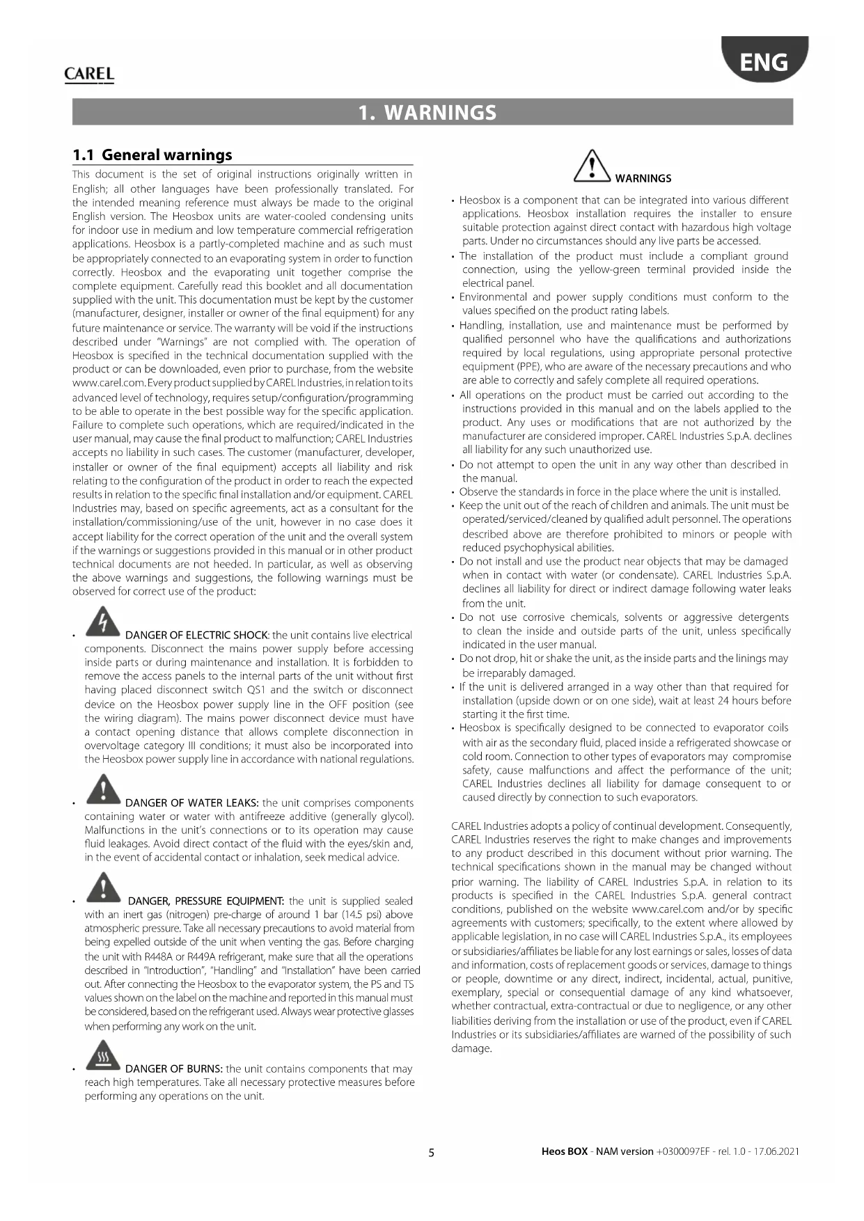 - Heosbox is specically designed to be connected to evaporator coils with air as the secondary uid, placed inside a refrigerated showcase or cold room. Connection to other types of evaporators may compromise safety, cause malfunctions and aect the performance of the unit; CAREL Industries declines all liability for damage consequent to or caused directly by connection to such evaporators. CAREL Industries adopts a policy of continual development. Consequently, CAREL Industries reserves the right to make changes and improvements to any product described in this document without prior warning. The technical specications shown in the manual may be changed without prior warning. The liability of CAREL Industries S.p.A. in relation to its products is specied in the CAREL Industries S.p.A. general contract conditions, published on the website www.carel.com and/or by specic agreements with customers; specically, to the extent where allowed by applicable legislation, in no case will CAREL Industries S.p.A., its employees or subsidiaries/aliates be liable for any lost earnings or sales, losses of data and information, costs of replacement goods or services, damage to things or people, downtime or any direct, indirect, incidental, actual, punitive, exemplary, special or consequential damage of any kind whatsoever, whether contractual, extra-contractual or due to negligence, or any other liabilities deriving from the installation or use of the product, even if CAREL Industries or its subsidiaries/aliates are warned of the possibility of such damage.6 Heos BOX - NAM version +0300097EF - rel. 1.0 - 17.06.2021 ENG