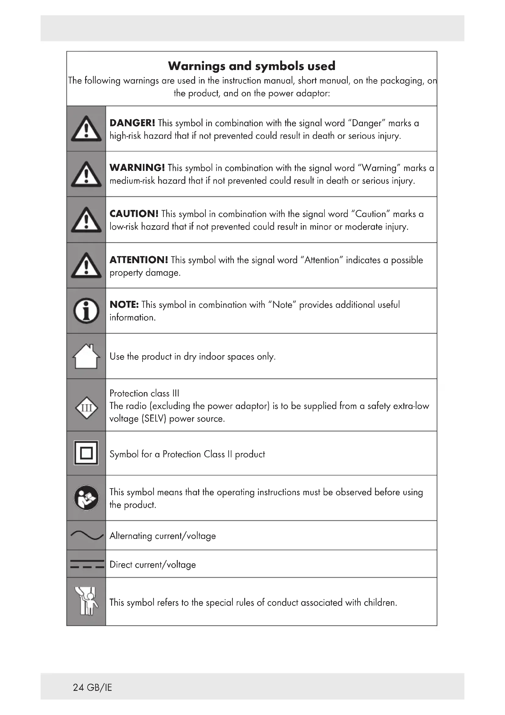 DANGER! RISK OF DEATH AND ACCIDENTS FOR TODDLERS AND CHILDREN! Packaging materials are not a toy. Never leave children unsupervised with the packaging material. The packaging material represents a danger of suffocation. Children frequently underestimate the dangers. Always keep children away from the packaging material. This product can be used by children aged from 8 years and above and persons with reduced physical, sensory or mental capabilities, or lack of experience and knowledge if they have been given supervision or instruction concerning use of the product in a safe way and understand the hazards involved. Cleaning and user maintenance shall not be made by children without supervision. Children shall not play with the product. The product is not a toy.28 GB/IE Risk of electric shock!