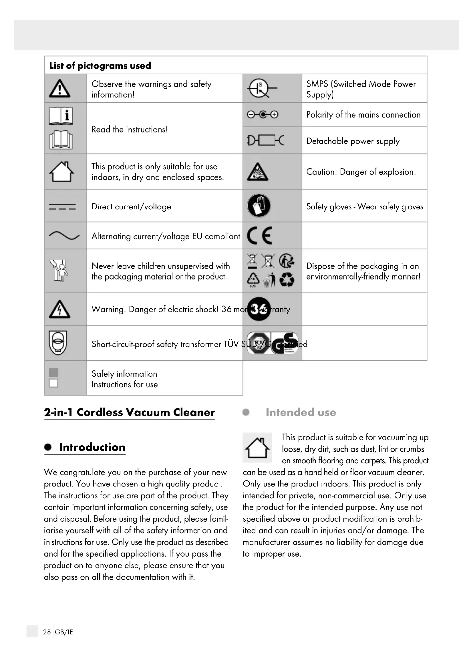 can be used as a hand-held or floor vacuum cleaner. Only use the product indoors. This product is only intended for private, non-commercial use. Only use the product for the intended purpose. Any use not specified above or product modification is prohibited and can result in injuries and/or damage. The manufacturer assumes no liability for damage due to improper use.