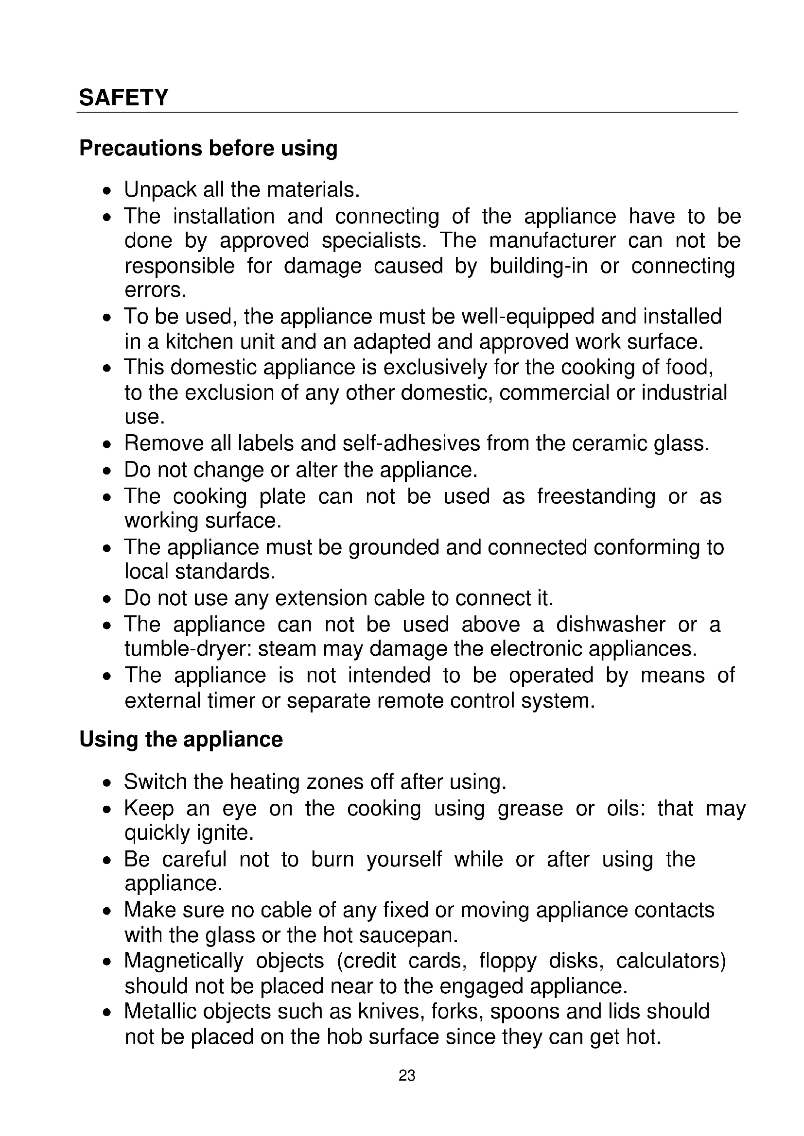 avoid the possibility of electric shock. Other protections Note sure that the container pan is always centred on the cooking zone. The bottom of the pan must have to cover as much as possible the cooking zone. For the users of pacemaker, the magnetic field could influence its operating. We recommend getting information to the retailer or of the doctor. Do not to use aluminium or synthetic material containers: they could melt on still hot cooking zones. NEVER try to extinguish a fire with water, but switch off the appliance and then cover flame e.g. with a lid or a fire blanket