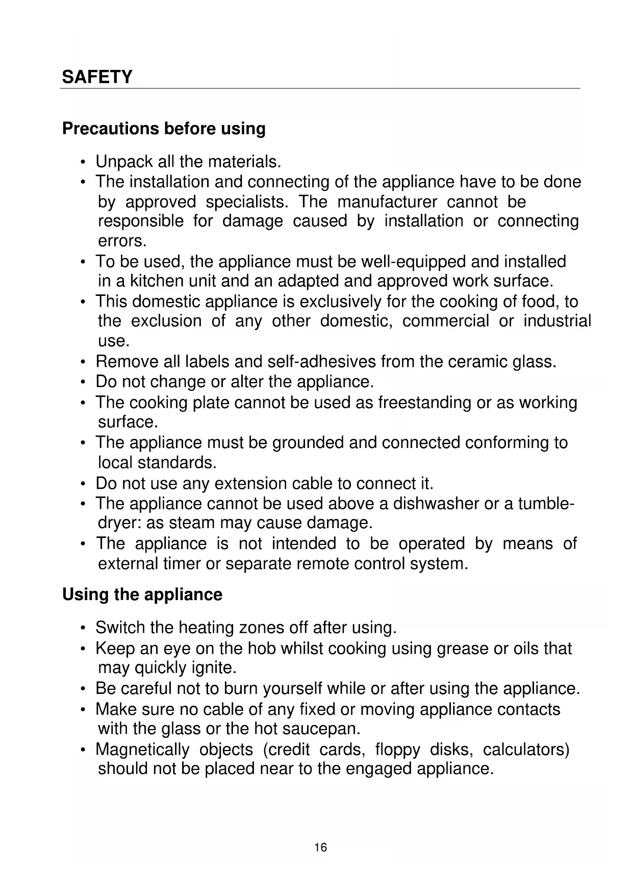 - Sugar, synthetic materials or aluminium sheets must not contact with the heating zones. These may cause breaks or other alterations of the vitroceramic glass by cooling: switch on the appliance and take them immediately out of the hot heating zone (be careful: do not burn yourself).