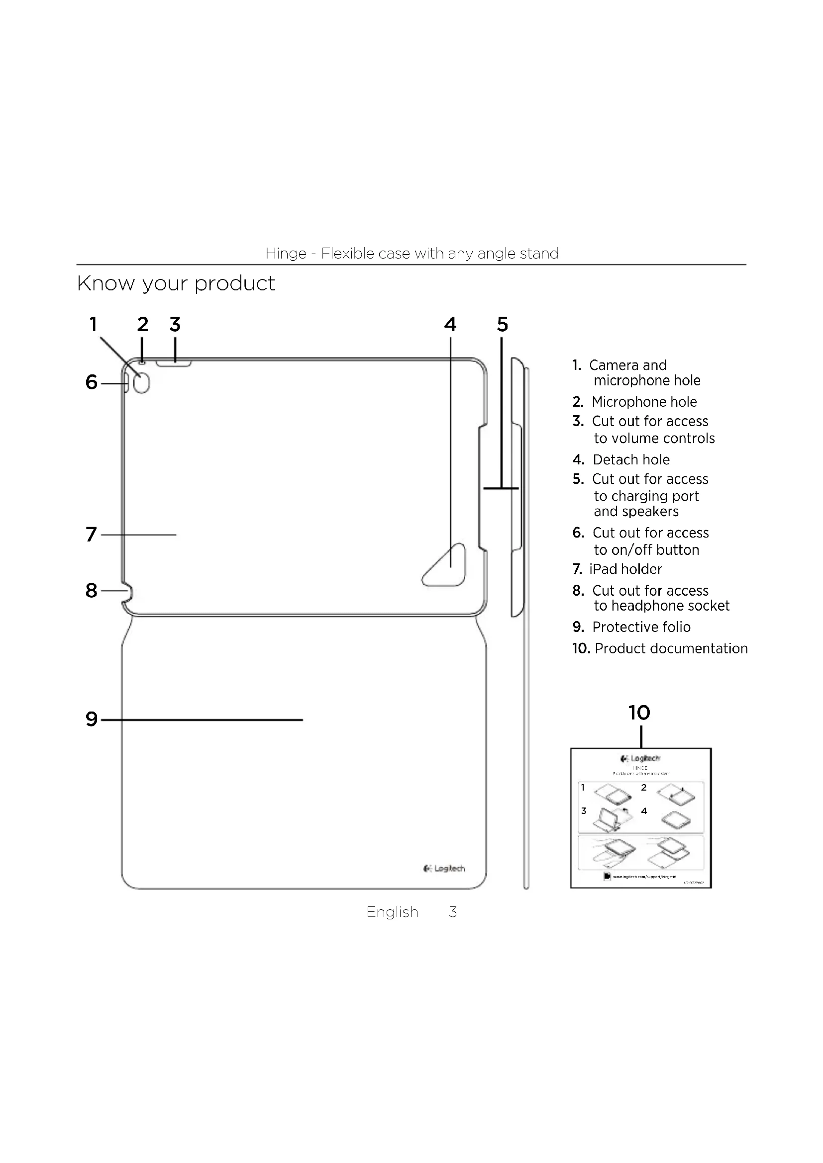 - Make sure your iPad is inserted in the iPad holder the right way round. When your iPad is inserted correctly, the camera on your iPad should be lined up with the camera access hole. What do you think? Please take a minute to tell us. Thank you for purchasing our product. www.logitech.com/ithink8 Deutsch Hinge – Flexibles Case mit frei verstellbarer Halterung Produkt auf einen Blick