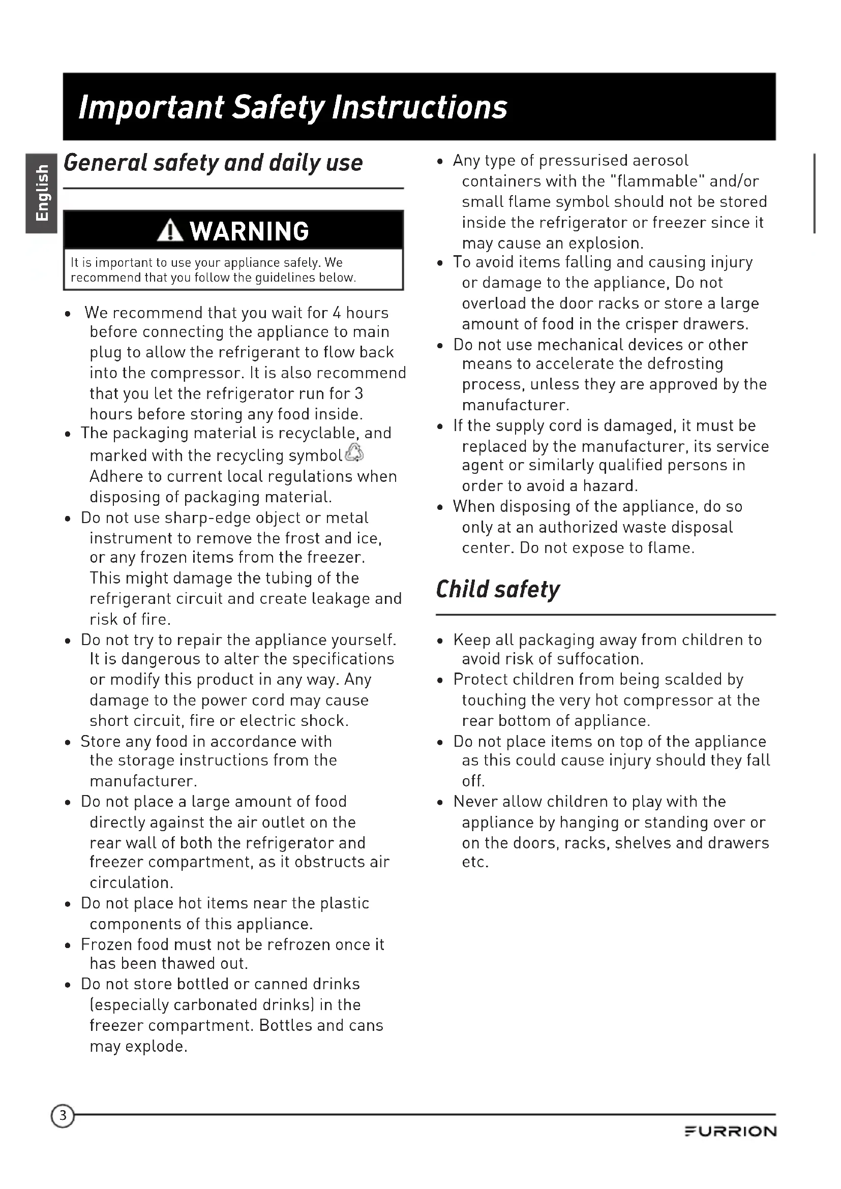 Thank you for purchasing this Furrion® 20 cu. ft. refrigerator. Before placing your new appliance into operation, please read these operating instructions carefully. They contain important information for safe use, installation and maintenance of the appliance.