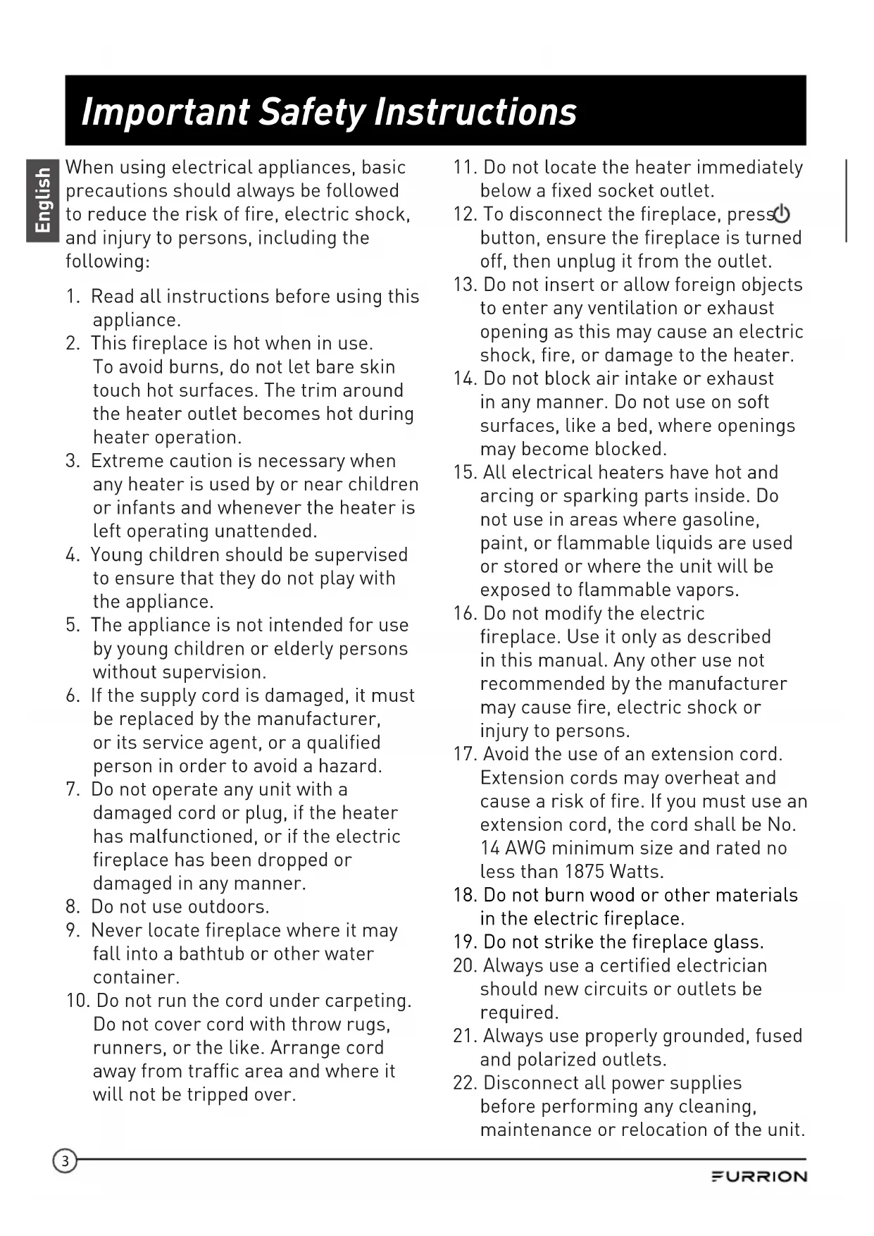 F.11 Care and Maintenance English WARNING ● Always disconnect the fireplace from the main power supply before performing any routine maintenance. ● Always utilize a qualified technician if assistance is required. ● Always install genuine Furrion replacement parts, which are available from your authorized dealer. Glass Cleaning CAUTION GLASS INFORMATION ● Never strike or slam the glass. ● Never use abrasive cleaners to clean the glass. ● Never attempt to operate this fireplace if any glass component is broken. ● Always utilize a qualified service technician to replace broken glass components and always install genuine Furrion tempered glass replacements, which are available from your authorized dealer. The glass is cleaned in the factory during the assembly operation. The clear door may collect dust particles during shipment, installation or handling, these can be removed by dusting lightly with a clean dry cloth. To remove fingerprints or other marks, the clear door can be cleaned with a damp cloth. The clear door should be completely dried with a lint free cloth to prevent water spots. To prevent scratching, do not use abrasive cleaners or spray liquids on the clear door surface. Fireplace Surface Cleaning Metal painted parts may be cleaned using a clean, damp cloth. Never use any abrasive cleaners and chemical agents as these may damage the paint finish. Cleaning of the screen diffuser is to be done using only water and a lint free cloth. DO NOT use any abrasive household cleaners as these products will damage the diffusing screen. Servicing The motors used on the fan heater and flame blower are pre-lubricated for extended bearing life and require no further lubrication. However, periodic cleaning/vacuuming of the appliance and around the air intake and exhaust is recommended.12 Troubleshooting English Problem Root Cause Corrective Action Display shows “EE” The thermostat sensor is broken or disconnected. Unplug the fireplace and remove the back panel. Check that the thermostat is plugged into the main circuit board. If this does not solve the problem, contact customer service for a replacement thermostat sensor. Display shows “88” Manual reset overheat protection has triggered. Inspect the fireplace and check that the air inlets and outlets are not blocked as this may cause overheating. Fireplace does not blow warm air. Cool down cycle Normal operation will continue for 30 seconds before shutting down. Thermostat setting is preventing the fireplace from turning on. Adjust the temperature setting to ensure that the thermostat is set higher than the current room temperature. The RED LED is blinking constantly and the blower motor does not start. Proximity switch cut off Ensure there are no obstructions within a minimum distance of 6 inches from the air vents. Press the Power button to restart the fireplace. The fireplace turns off automatically. The slide out moves and activates the safety cut off. Do not use the fireplace if the slide out is not in the fully extended position. Remote control is not working Weak or defective batteries Replace the remote batteries. Poor signal Press the remote control buttons with an even motion and gentle pressure. Repeatedly pressing buttons in rapid succession may cause the remote to malfunction. Distance Operate the remote at a distance less than 20 feet from the front of the fireplace. Point the remote at the control panel.13 Specifications English
