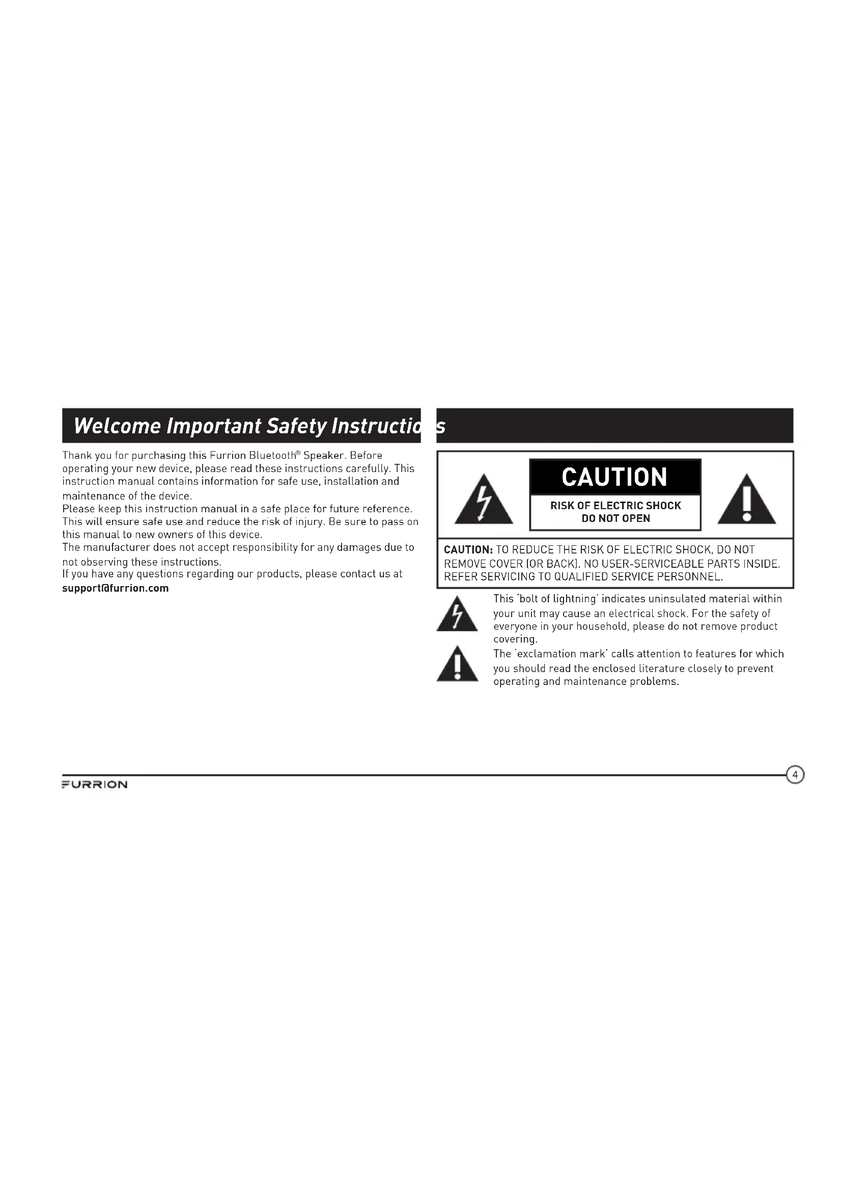 Speaker. Before operating your new device, please read these instructions carefully. This instruction manual contains information for safe use, installation and maintenance of the device. Please keep this instruction manual in a safe place for future reference. This will ensure safe use and reduce the risk of injury. Be sure to pass on this manual to new owners of this device. The manufacturer does not accept responsibility for any damages due to not observing these instructions. If you have any questions regarding our products, please contact us at support@furrion.com Welcome Important Safety Instructions5