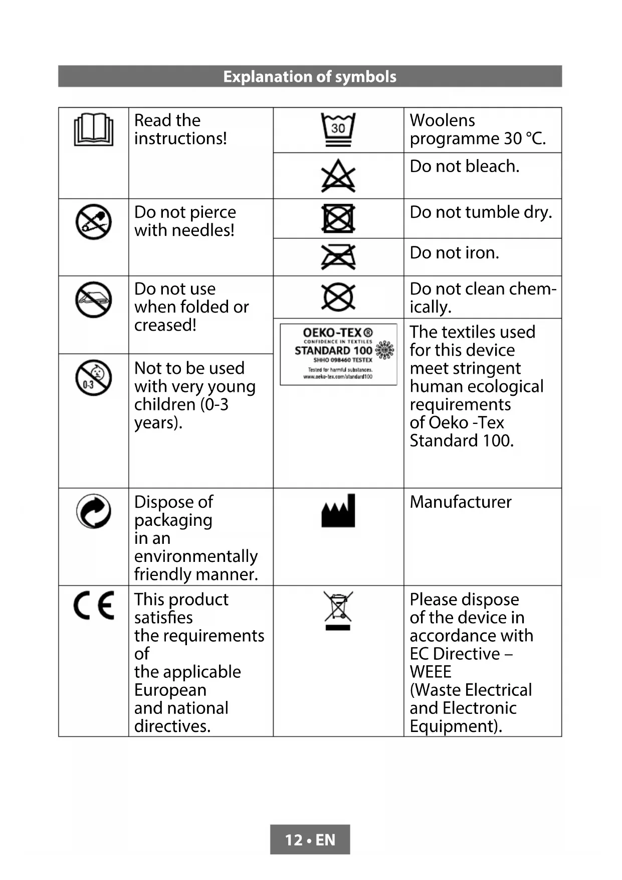 the applicable European and national directives. Please dispose of the device in accordance with EC Directive – WEEE (Waste Electrical and Electronic Equipment). 12 • EN Explanation of symbolsThe device has double protective insulation and therefore complies with protection class 2. The electric blanket is suitable for 1 person. WARNING; Warning of risk of injury or danger to your health. CAUTION; Safety information about possible damage to the device/accessories. ATTENTION; Refers to important information. 13 • ENSafety instructions Important safety instructions - read carefully and keep for later reference! WARNING