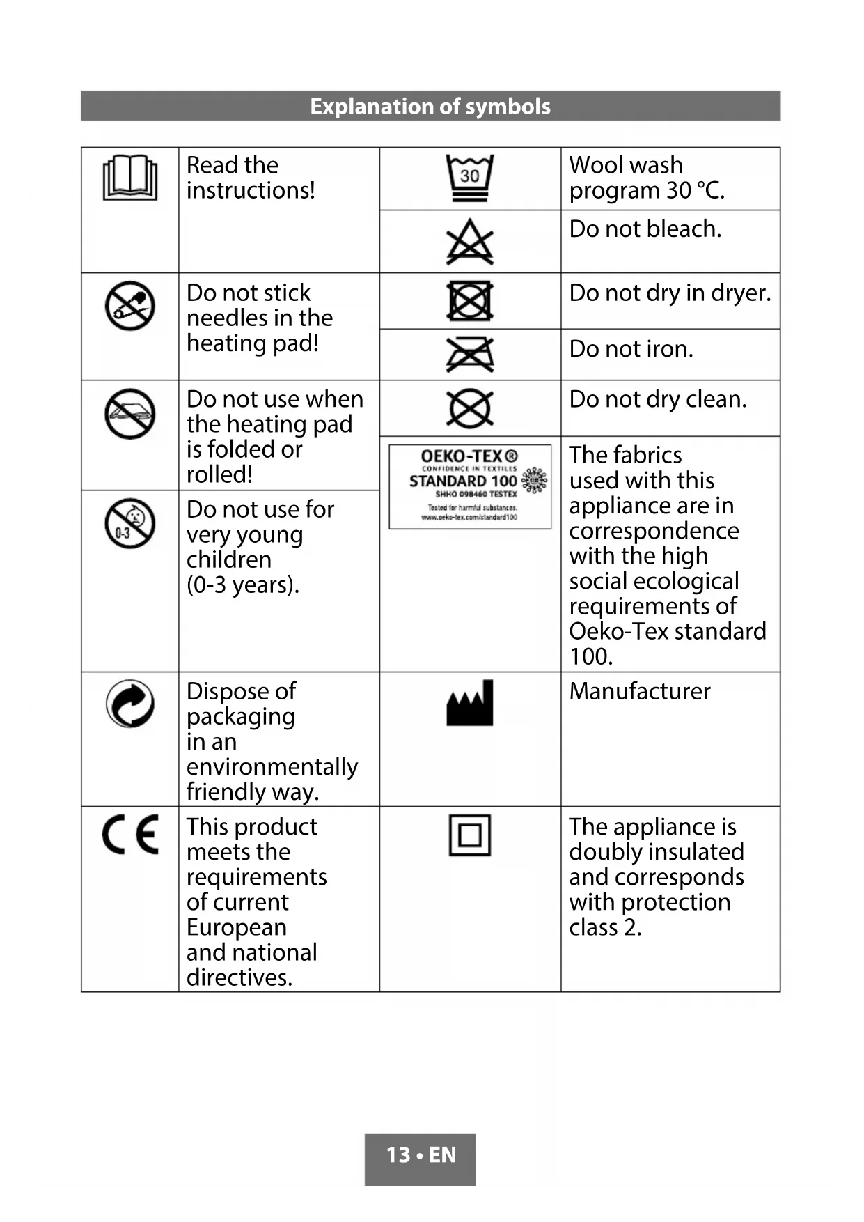 - Small stains on the heating pad can be removed with a cloth or a damp sponge and, if necessary, a little bit of gentle detergent liquid. CAUTION! The heating pad should not be dry cleaned, spun, dried in the machine, mangled or ironed. Otherwise the heating pad could get damaged.