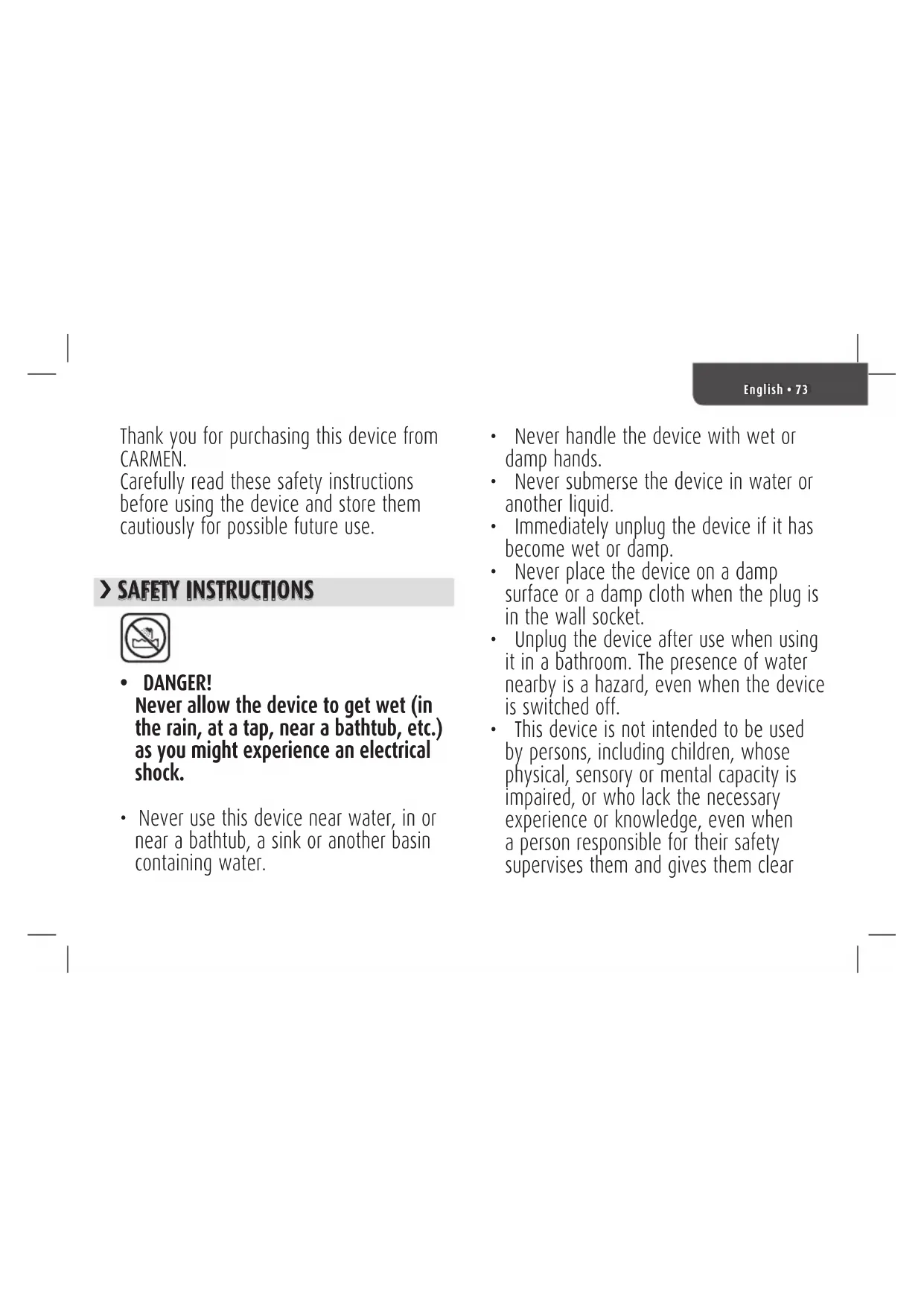 - Garanzia scaduta.English • 73 Thank you for purchasing this device from CARMEN. Carefully read these safety instructions before using the device and store them cautiously for possible future use. › SAFETY INSTRUCTIONS