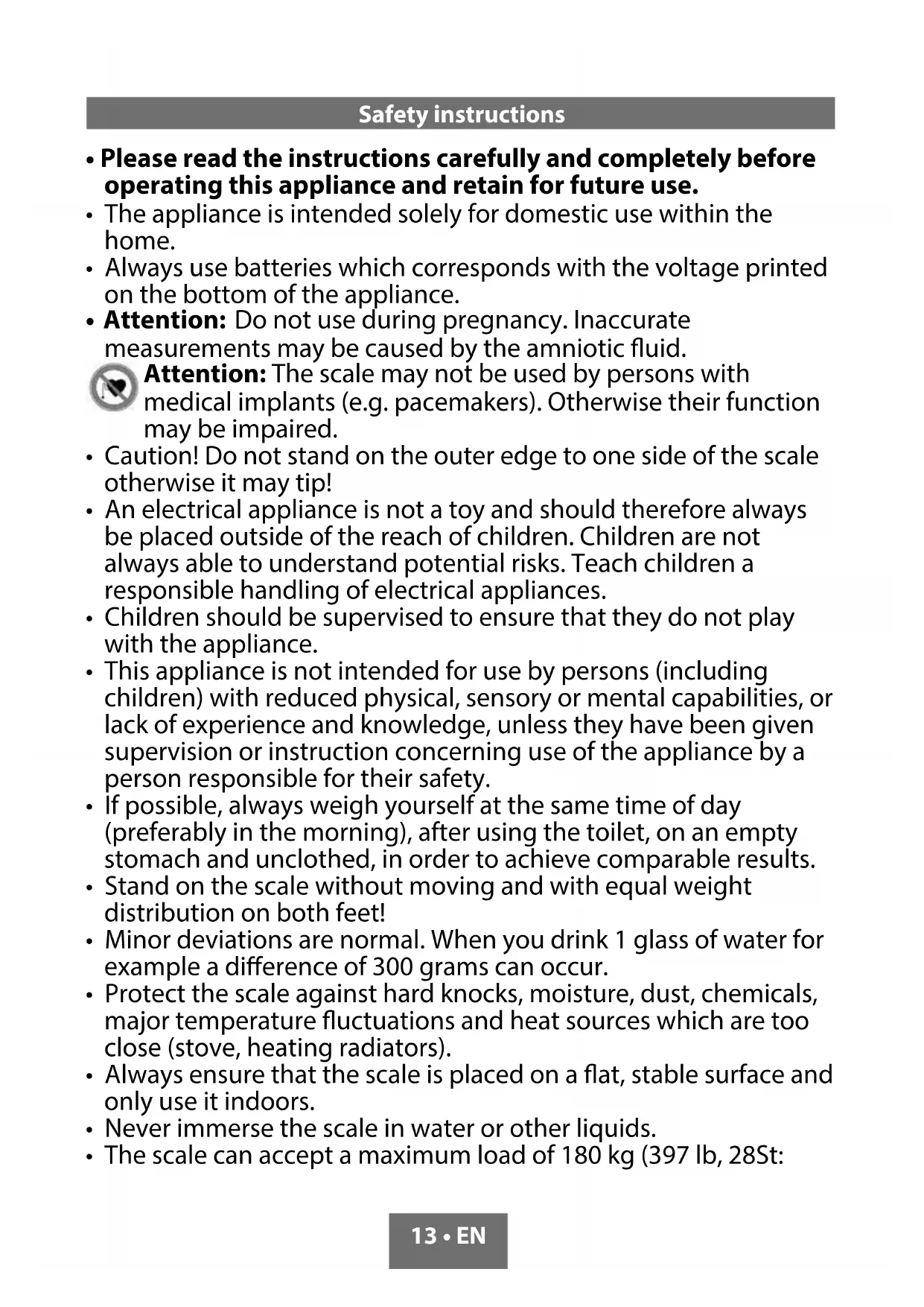 Attention: The scale may not be used by persons with medical implants (e.g. pacemakers). Otherwise their function may be impaired.