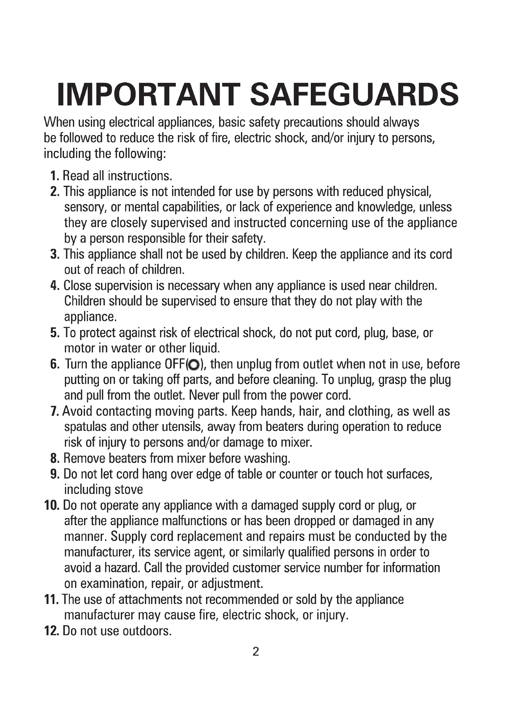 IMPORTANT SAFEGUARDS3 This appliance is intended for household use only. w WARNING Electrical Shock Hazard: This appliance is provided with a polarized plug (one wide blade) to reduce the risk of electric shock. The plug fits only one way into a polarized outlet. Do not defeat the safety purpose of the plug by modifying the plug in any way or by using an adapter. If the plug does not fit fully into the outlet, reverse the plug. If it still does not fit, have an electrician replace the outlet. The length of the cord used on this appliance was selected to reduce the hazards of becoming tangled in or tripping over a longer cord. If a longer cord is necessary, an approved extension cord may be used. The electrical rating of the extension cord must be equal to or greater than the rating of the appliance. Care must be taken to arrange the extension cord so that it will not drape over the countertop or tabletop where it can be pulled on by children or accidentally tripped over. w CAUTION Moving Parts Hazard. To reduce the risk of personal injury, always unplug mixer before inserting or removing beaters. Wattage/Peak Power Information The marked rating of the hand mixer is determined by Underwriters Laboratories as the maximum stabilized power consumption of the hand mixer at high speed under a loaded condition. Peak power is an average of the maximum wattage a hand mixer may consume during initial operation at high speed.