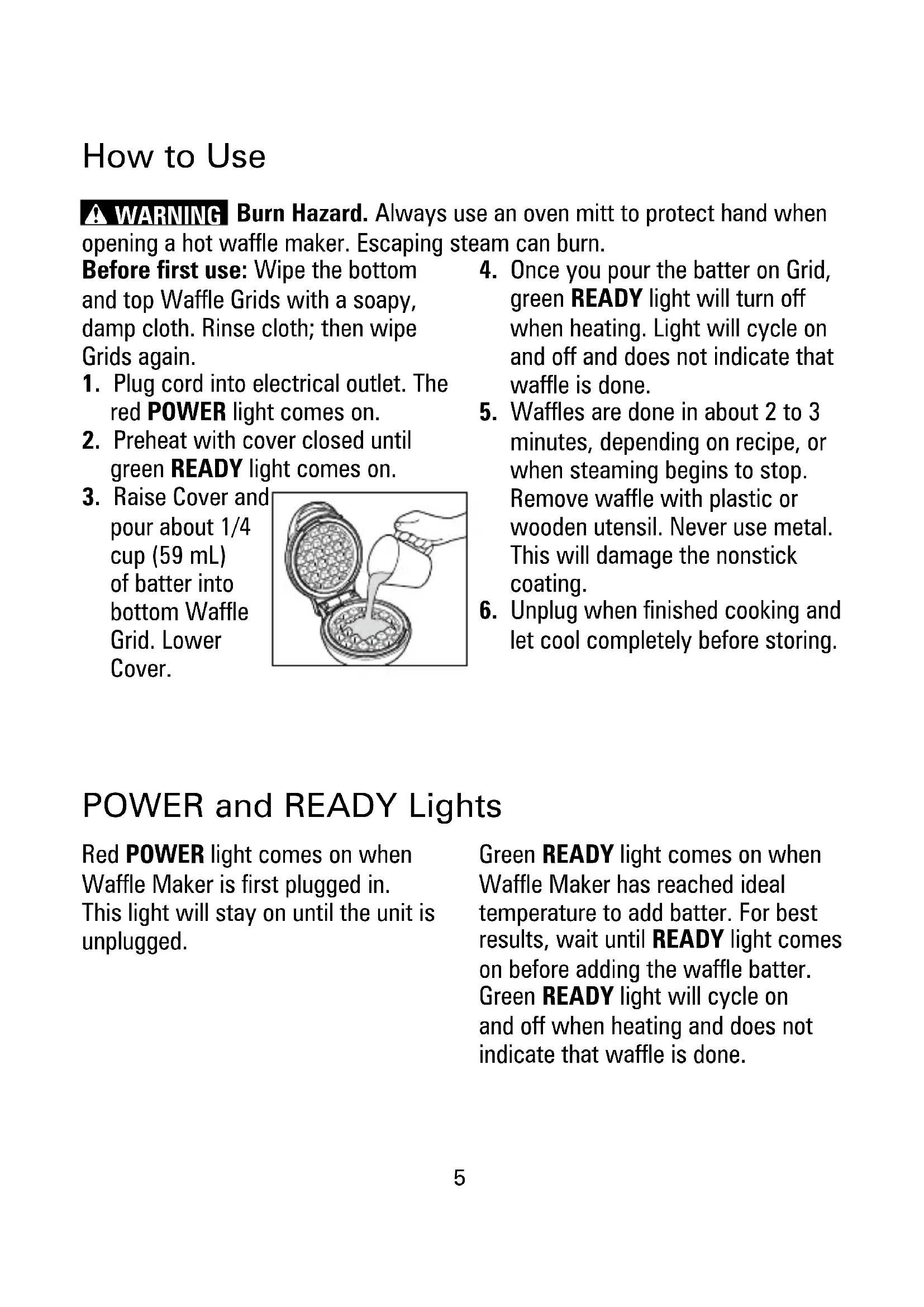 POWER READY5 How to Use w WARNING Burn Hazard. Always use an oven mitt to protect hand when opening a hot wafe maker. Escaping steam can burn. Before first use: Wipe the bottom and top Waffle Grids with a soapy, damp cloth. Rinse cloth; then wipe Grids again.
