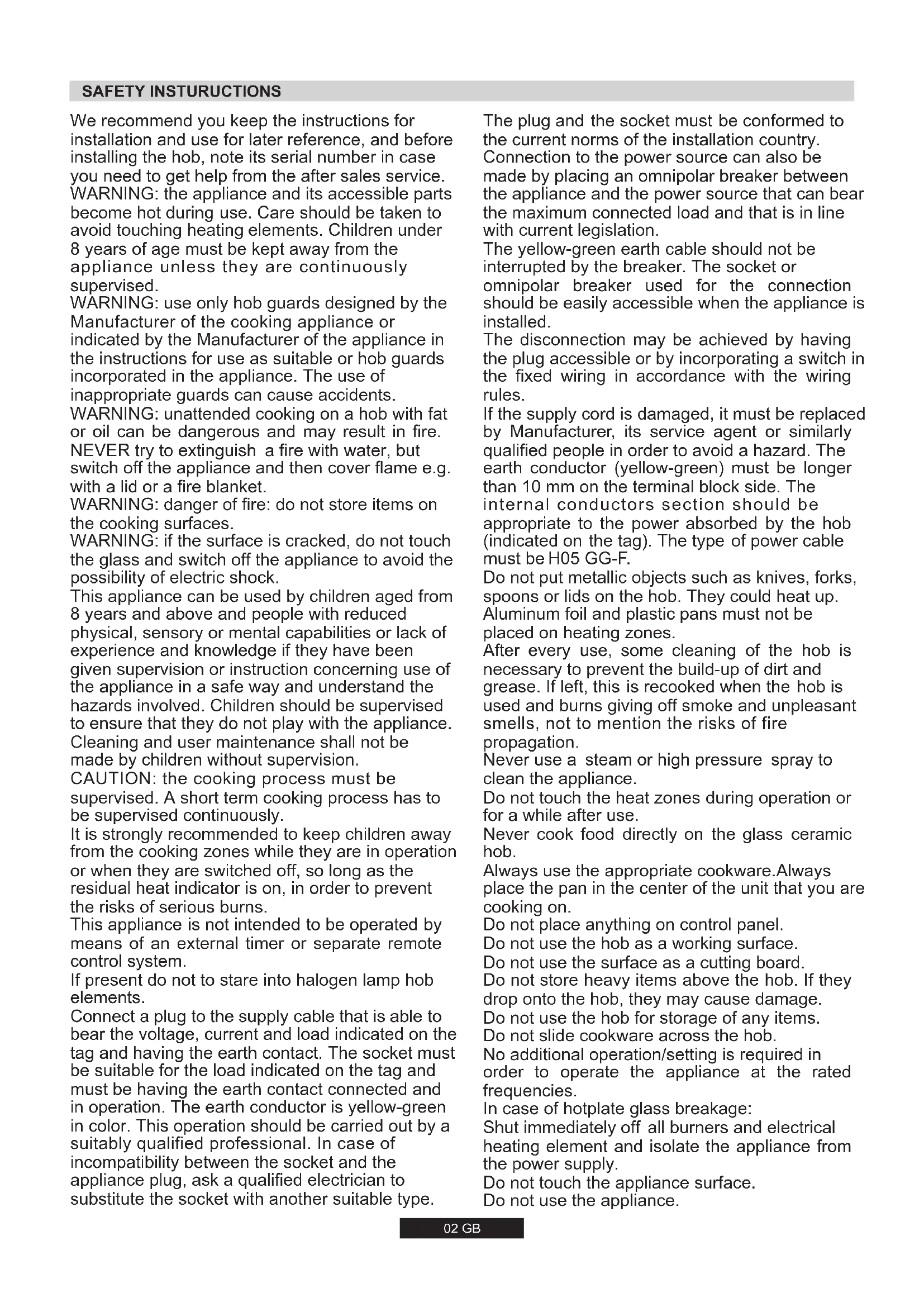 SK 60 CANDY HOOVER GROUP S.R.L. • Via Comolli 16 • 20861 Brugherio (MB) Italy02 GB SAFETY INSTURUCTIONS We recommend you keep the instructions for installation and use for later reference, and before installing the hob, note its serial number in case you need to get help from the after sales service. If present do not to stare into halogen lamp hob elements. CAUTION: the cooking process must be supervised. A short term cooking process has to be supervised continuously. It is strongly recommended to keep children away from the cooking zones while they are in operation or when they are switched off, so long as the residual heat indicator is on, in order to prevent the risks of serious burns. Connect a plug to the supply cable that is able to bear the voltage, current and load indicated on the tag and having the earth contact. The socket must be suitable for the load indicated on the tag and must be having the earth contact connected and in operation. The earth conductor is yellow-green in color. This operation should be carried out by a suitably qualified professional. In case of incompatibility between the socket and the appliance plug, ask a qualified electrician to substitute the socket with another suitable type.