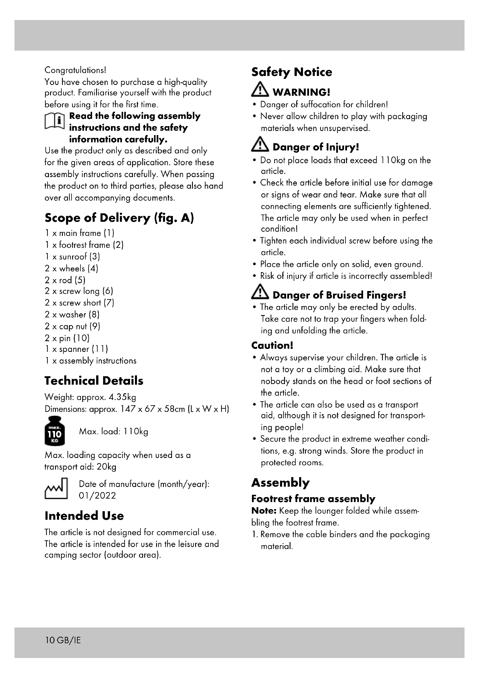 material. Congratulations! You have chosen to purchase a high-quality product. Familiarise yourself with the product before using it for the first time. Read the following assembly instructions and the safety information carefully. Use the product only as described and only for the given areas of application. Store these assembly instructions carefully. When passing the product on to third parties, please also hand over all accompanying documents. Scope of Delivery (fig. A) 1 x main frame (1) 1 x footrest frame (2) 1 x sunroof (3) 2 x wheels (4) 2 x rod (5) 2 x screw long (6) 2 x screw short (7) 2 x washer (8) 2 x cap nut (9) 2 x pin (10) 1 x spanner (11) 1 x assembly instructions Technical Details Weight: approx. 4.35kg Dimensions: approx. 147 x 67 x 58cm (L x W x H)