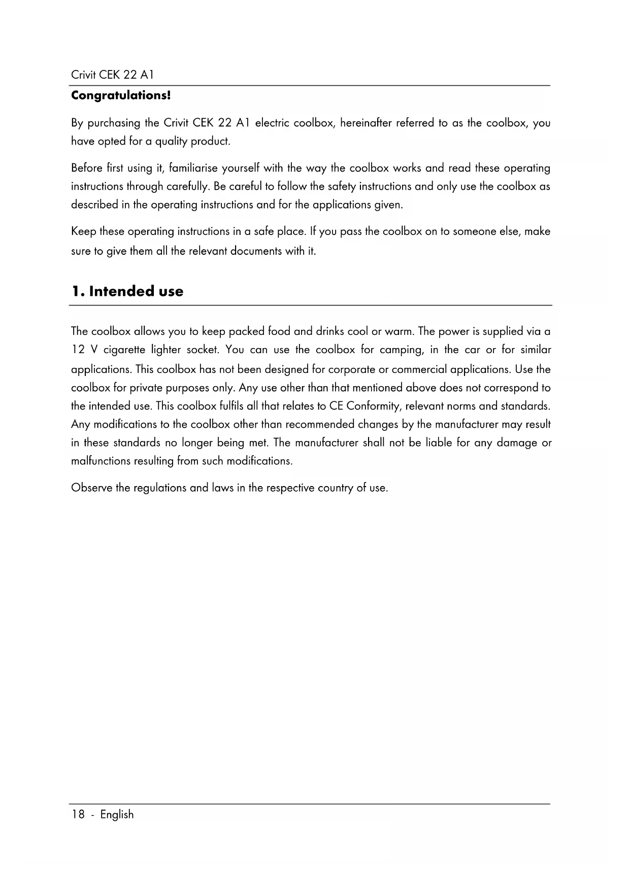 The coolbox allows you to keep packed food and drinks cool or warm. The power is supplied via a 12 V cigarette lighter socket. You can use the coolbox for camping, in the car or for similar applications. This coolbox has not been designed for corporate or commercial applications. Use the coolbox for private purposes only. Any use other than that mentioned above does not correspond to the intended use. This coolbox fulfils all that relates to CE Conformity, relevant norms and standards. Any modifications to the coolbox other than recommended changes by the manufacturer may result in these standards no longer being met. The manufacturer shall not be liable for any damage or malfunctions resulting from such modifications. Observe the regulations and laws in the respective country of use.Crivit CEK 22 A1 English - 19