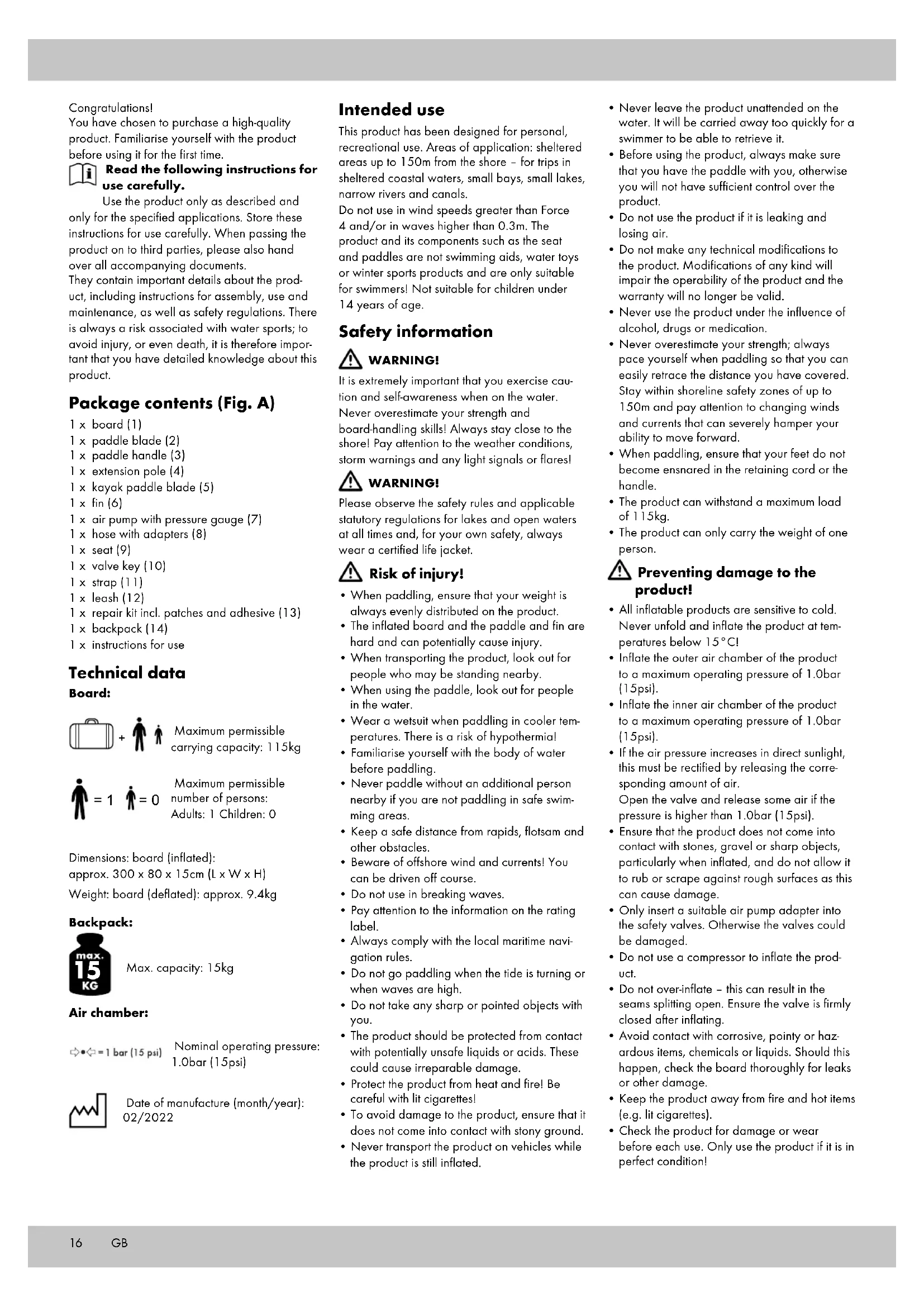 Max. capacity: 15kg Air chamber: Nominal operating pressure: 1.0bar (15psi) Date of manufacture (month/year): 02/2022 Intended use This product has been designed for personal, recreational use. Areas of application: sheltered areas up to 150m from the shore – for trips in sheltered coastal waters, small bays, small lakes, narrow rivers and canals. Do not use in wind speeds greater than Force 4 and/or in waves higher than 0.3m. The product and its components such as the seat and paddles are not swimming aids, water toys or winter sports products and are only suitable for swimmers! Not suitable for children under 14 years of age. Safety information WARNING! It is extremely important that you exercise cau- tion and self-awareness when on the water. Never overestimate your strength and board-handling skills! Always stay close to the shore! Pay attention to the weather conditions, storm warnings and any light signals or flares! WARNING! Please observe the safety rules and applicable statutory regulations for lakes and open waters at all times and, for your own safety, always wear a certified life jacket. Risk of injury!