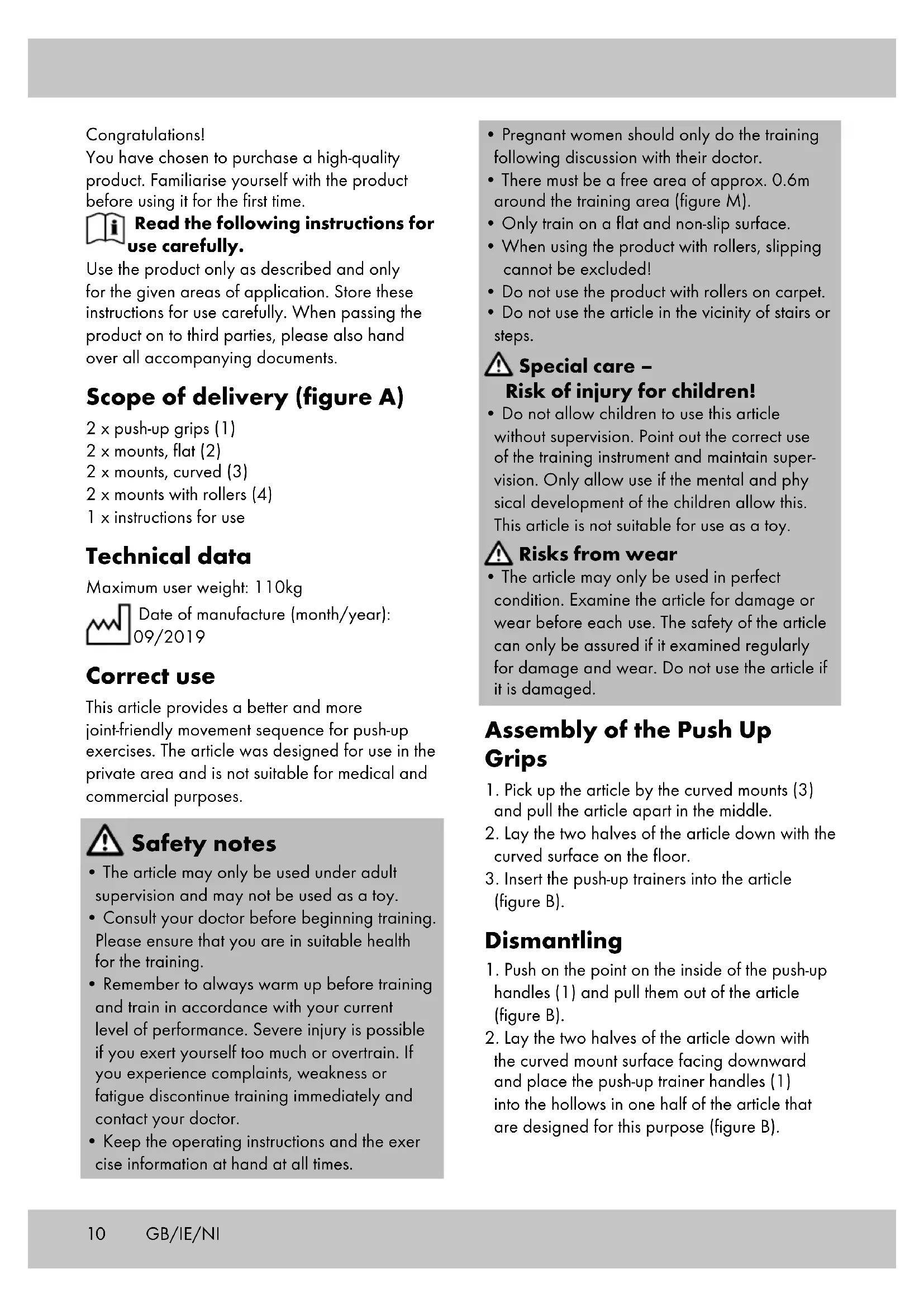 the curved mount surface facing downward and place the push-up trainer handles (1) into the hollows in one half of the article that are designed for this purpose (figure B). Congratulations! You have chosen to purchase a high-quality product. Familiarise yourself with the product before using it for the first time. Read the following instructions for use carefully. Use the product only as described and only for the given areas of application. Store these instructions for use carefully. When passing the product on to third parties, please also hand over all accompanying documents. Scope of delivery (figure A) 2 x push-up grips (1) 2 x mounts, flat (2) 2 x mounts, curved (3) 2 x mounts with rollers (4) 1 x instructions for use Technical data Maximum user weight: 110kg Date of manufacture (month/year): 09/2019 Correct use This article provides a better and more joint-friendly movement sequence for push-up exercises. The article was designed for use in the private area and is not suitable for medical and commercial purposes. Safety notes