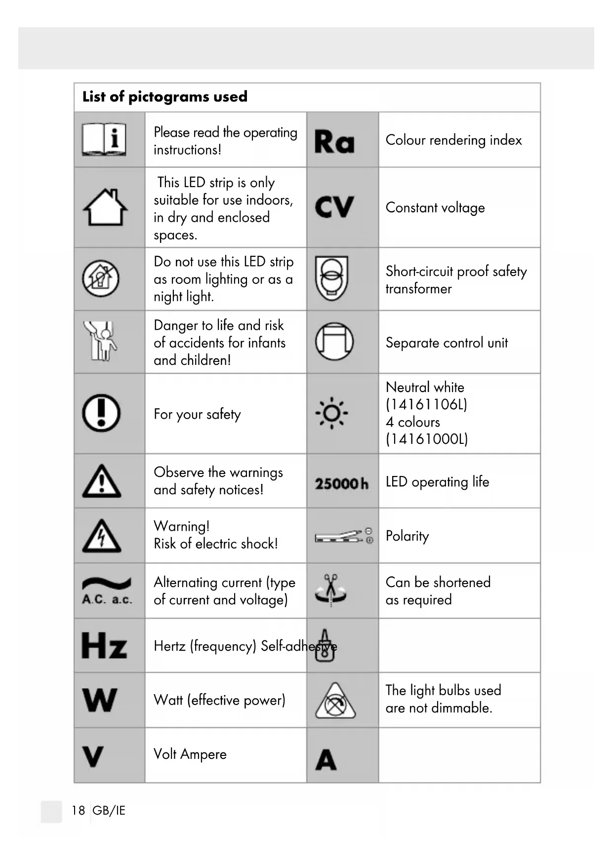 List of pictograms used .......................................................Page 18 Introduction ................................................................................... Page 20 Intended use ........................................................................................Page 20 Scope of delivery .................................................................................Page 20 Parts description...................................................................................Page 21 Technical data .....................................................................................Page 21 Safety..................................................................................................Page 21 Safety instructions ................................................................................ Page 21 Initial use ..........................................................................................Page 24 Trimming/connecting the LED tape ....................................................Page 24 Installing the LED strip ..........................................................Page 24 Maintenance and cleaning ..............................................Page 25 Disposal.............................................................................................Page 25 Warranty and service .......................................................... Page 26 Warranty ..............................................................................................Page 26 Service address ...................................................................................Page 26 Declaration of conformity....................................................................Page 27 Manufacturer ....................................................................................... Page 2718 GB/IE List of pictograms used Please read the operating instructions! Colour rendering index This LED strip is only suitable for use indoors, in dry and enclosed spaces. Constant voltage Do not use this LED strip as room lighting or as a night light. Short-circuit proof safety transformer Danger to life and risk of accidents for infants and children! Separate control unit For your safety Neutral white (14161106L) 4 colours (14161000L) Observe the warnings and safety notices! LED operating life Warning! Risk of electric shock! Polarity Alternating current (type of current and voltage) Can be shortened as required Hertz (frequency) Self-adhesive Watt (effective power) The light bulbs used are not dimmable. Volt Ampere19 GB/IE List of pictograms used 14161106L: To prevent hazards, if an operating unit on this product is damaged, it must be replaced by the manu- facturer, its service rep- resentative or an equally qualified professional. 14161106L: To prevent hazards, if an illuminant on this product is damaged, it must be replaced by the manufacturer, its ser- vice representative or an equally qualified profes- sional. Protection class II Light temperature in Kelvin Direct current (type of current and voltage) The packaging is made from 100 % recycled paper. Safety extra-low voltage Dispose of the packag- ing and device in an environmentally friendly manner! Milliampere Polyethylene (low density) This light has protection level “IP20” and is only intended for residential use indoors. Other plastics such as polycarbonate (PC), pol- yamide (PA), acrylonitrile butadiene styrene (ABS), polymethylmethacrylate (PMMA), polylactide (PLA), etc. Ambient temperature Corrugated cardboard Housing temperature at stated point20 GB/IE 3 m LED Light Strip Introduction Please be sure to carefully read the complete instructions for use. These instructions are part of the product and contain important information on setup and handling. Always follow all safety instructions. Before using this product for the first time verify the correct voltage and that all parts are properly installed. If you have any questions or you are unsure about operating the product, please contact the distributor or service centre. Please keep these instructions in a safe place and pass them on to third parties if necessary. Intended use This LED strip is only suitable for use indoors, in dry and enclosed spaces. This device is only intended for use in a private domestic environment, not for commercial use. Any use other than that described above is prohibited and will result in product damage. It is further associated with dangers, e.g. short circuit, fire, electric shock, etc. This product is intended for normal operation. Only for 14161000L: This product is a decorative light. Do not use this LED strip as room lighting or as a night light. Scope of delivery Check immediately after unpacking that the parts are complete and that the product is in proper condition. 1 LED Light Strip 2 connectors 4 end caps 2 cable holder 1 adhesive strip 1 set of instructions for use21 GB/IE Parts description
