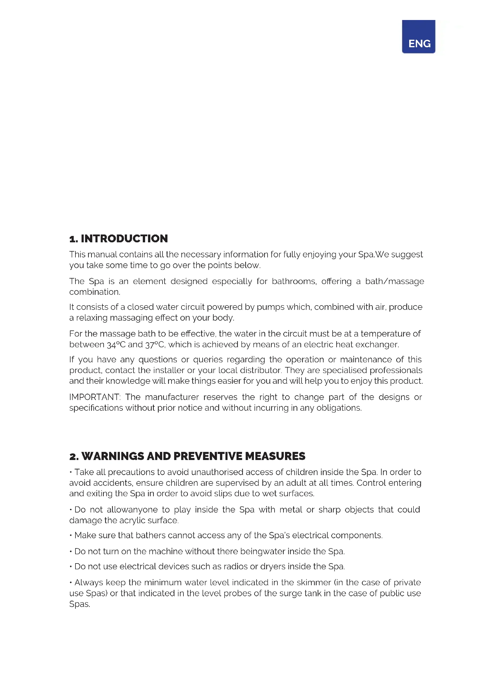 This manual contains all the necessary information for fully enjoying your Spa.We suggest you take some time to go over the points below. The Spa is an element designed especially for bathrooms, oering a bath/massage combination. It consists of a closed water circuit powered by pumps which, combined with air, produce a relaxing massaging eect on your body. For the massage bath to be eective, the water in the circuit must be at a temperature of between 34ºC and 37ºC, which is achieved by means of an electric heat exchanger. If you have any questions or queries regarding the operation or maintenance of this product, contact the installer or your local distributor. They are specialised professionals and their knowledge will make things easier for you and will help you to enjoy this product. IMPORTANT: The manufacturer reserves the right to change part of the designs or specications without prior notice and without incurring in any obligations.