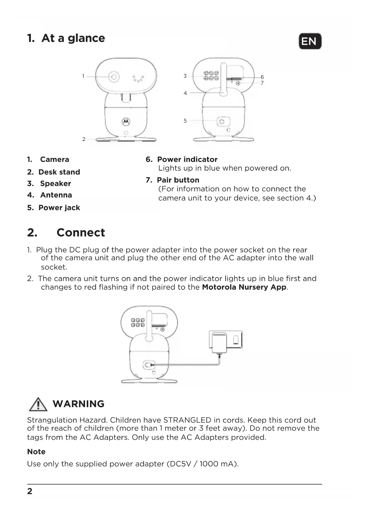 changes to red flashing if not paired to the Motorola Nursery App. WARNING Strangulation Hazard. Children have STRANGLED in cords. Keep this cord out of the reach of children (more than 1 meter or 3 feet away). Do not remove the tags from the AC Adapters. Only use the AC Adapters provided. Note Use only the supplied power adapter (DC5V / 1000 mA).