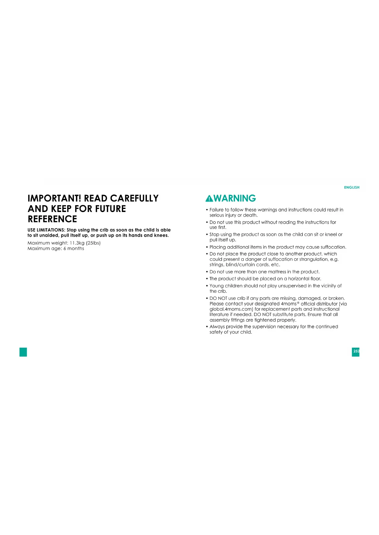 - DO NOT use crib if any parts are missing, damaged, or broken. Please contact your designated 4moms